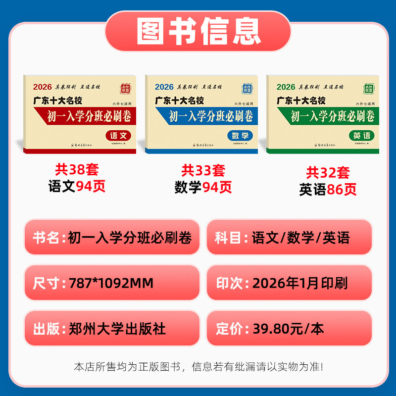《广东十大名校初一入学分班必刷卷》专为六年级升七年级学生精心打造,涵盖语文、数学、英语三科,紧扣人教版教材重点。试卷精选广东重点初中招生摸底真题,题型典型、难度适中,全面考查学生基础知识与综合运用能力。内容包含专项训练与期末模拟,帮助学生系统复习、查漏补缺,快速适应初中学习节奏。试卷结构科学,贴近实际分班考命题趋势,是小升初总复习的高效资料。通过反复练习,学生可提升解题速度与应试技巧,为顺利进入理想初中、赢得分班优势奠定坚实基础。适合广东地区六年级下学期学生使用,助力升学冲刺。
