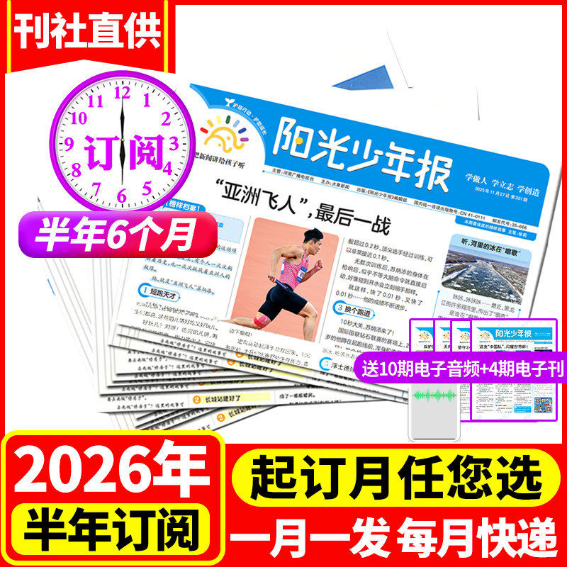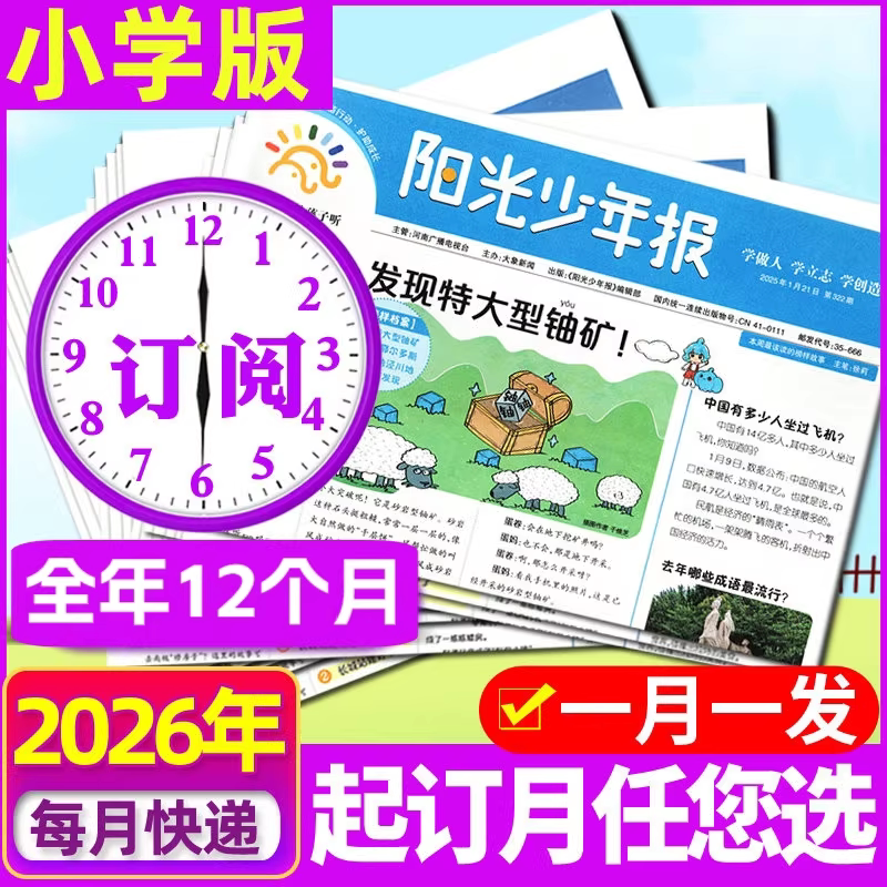 《阳光少年报》初中版“阳光大少年”专为初中生打造,聚焦时事热点、科学探索与人文素养,内容生动有趣、语言贴近青少年。2026年1-3月新全年/半年订阅服务现已开启,同时提供2025年1-12月春夏秋冬季合订本,涵盖小学版与初中版,便于系统阅读与收藏。报纸坚持正面引导,弘扬正能量,助力学生拓宽视野、提升思辨能力。无论是日常学习还是假期阅读,都是培养青少年社会责任感与综合素养的理想读物。订阅便捷,定期送达,让优质内容伴随孩子健康成长。
