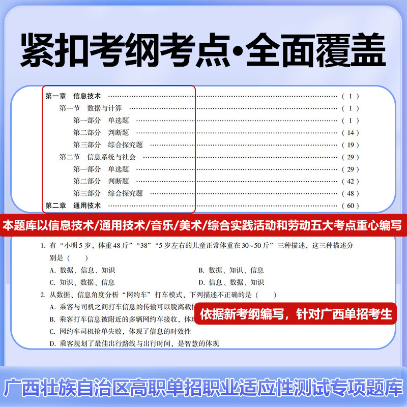 2026版广西省高职单招复习资料《综合素质职业适应性测试专项题库》专为备战高等院校单招考试的考生精心编写,涵盖音乐、美术、信息技术、通用技术、综合实践及劳动教育等核心科目。本题库紧扣最新考试大纲,题型全面,内容精炼,注重考查学生的综合素养与职业适应能力。通过典型例题、模拟训练与真题解析,帮助考生夯实基础、提升应试技巧。同时融入劳动教育与综合实践模块,强化实践应用能力,契合新时代职业教育改革方向。适用于广西地区高职单招考生系统复习,是冲刺理想院校的高效备考工具。