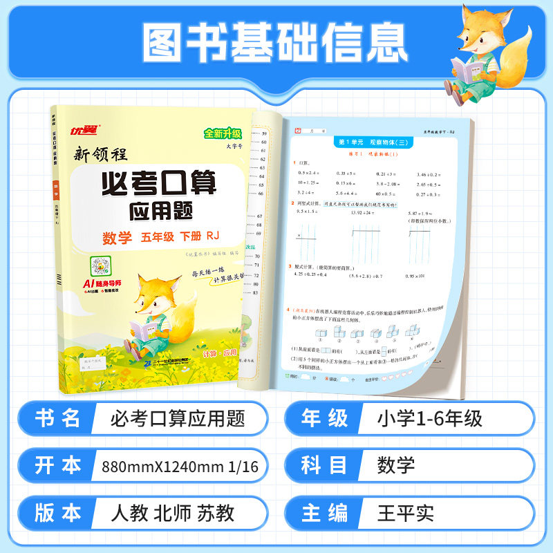 2026春《优翼新领程必考口算应用题》全新升级,专为小学一至六年级学生设计,涵盖人教版、北师版、苏教版教材内容,上下册同步配套。本书采用大字号排版,保护学生视力,提升阅读舒适度。内容聚焦口算与应用题专项训练,题型丰富、梯度合理,紧扣新课标要求与考试重点,强化计算能力与数学思维。每册按课时同步编排,讲练结合,配有详细解析,便于学生自学与家长辅导。通过系统练习,帮助学生夯实基础、提升解题速度与准确率,是小学生数学学习的得力助手,助力高效提分,赢在起跑线。