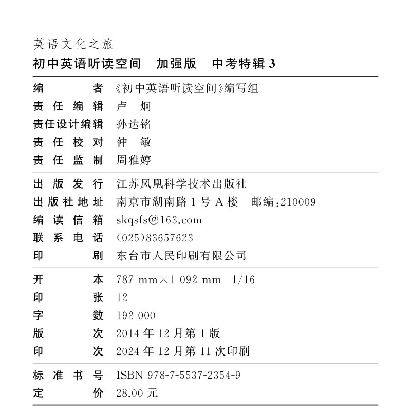 《2025秋新版初中英语听读空间中考特辑3加强版》是专为九年级学生备战中考精心编写的英语听读训练资料,依据译林版教材同步设计,由江苏凤凰科学技术出版社推出。本书紧扣新课标要求与江苏中考命题趋势,精选贴近生活、富有时代感的听力与阅读素材,题型全面,难度分层,强化核心考点训练。配备标准录音,提升听力理解能力;阅读部分注重语篇分析与解题技巧,助力学生突破重难点。全书结构清晰,讲练结合,是九年级学生夯实基础、提升综合语言运用能力的优质助学资源,助力中考英语高效提分。