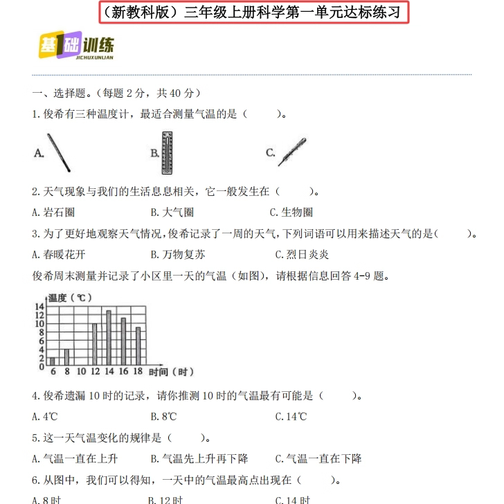 《新教材教科版小学科学三四五六年级上下册重点知识点复习常考汇总单元专项练习题本》是一本专为小学中高年级学生设计的科学复习资料。本书紧扣教科版教材,系统梳理三至六年级上下册各单元核心知识点,涵盖物质科学、生命科学、地球与宇宙、技术与工程四大领域。内容以“重点归纳+常考题型+专项练习”为主线,帮助学生夯实基础、突破难点。每单元配有典型例题和分层练习题,题型多样,贴近考试实际,强化理解与应用能力。适合课前预习、课后巩固及期末总复习使用,是提升科学素养、提高学业成绩的高效学习工具。