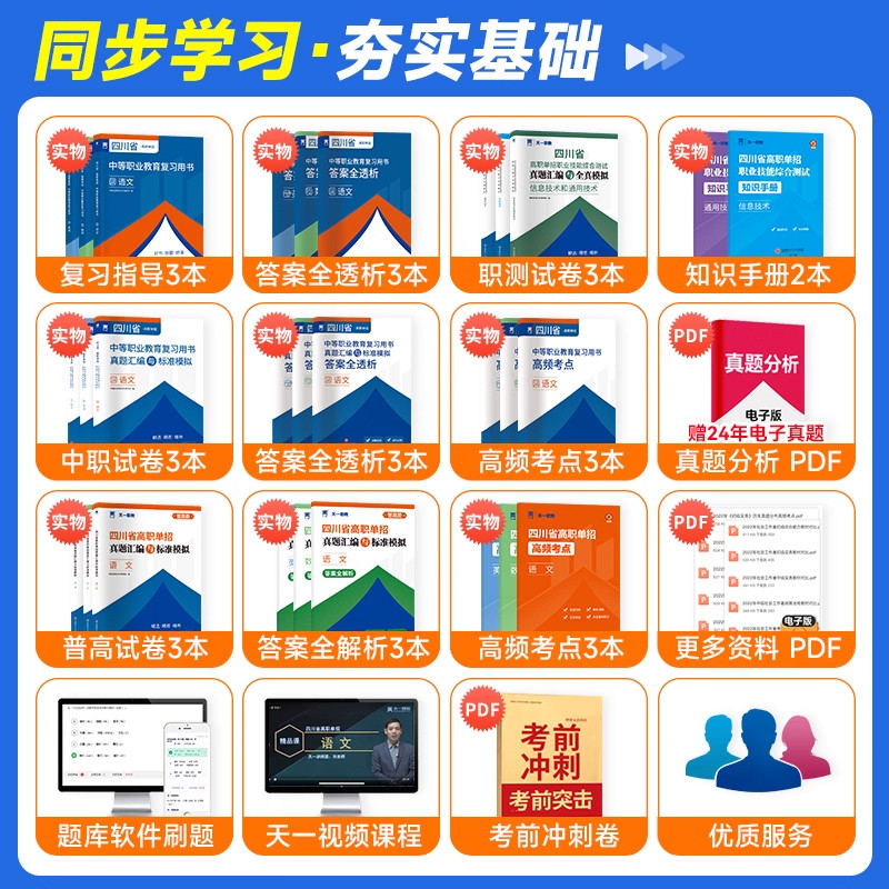 2026年四川单招考试复习资料(通用信息技术、语数英)专为高职单招考生打造,涵盖普高类、中职对口升学及职教高考方向。资料包含四川省历年真题、精选模拟试卷及天一测试电子版,内容紧扣最新考纲,突出计算机基础、信息技术应用等核心知识点。语文、数学、英语部分注重基础巩固与应试技巧,题型贴近实际考试,助力考生高效备考。电子版资料便于下载、打印与反复练习,适合自主复习与课堂强化使用,是备战2026年四川高职单招的权威辅助工具,全面提升应试能力与录取竞争力。