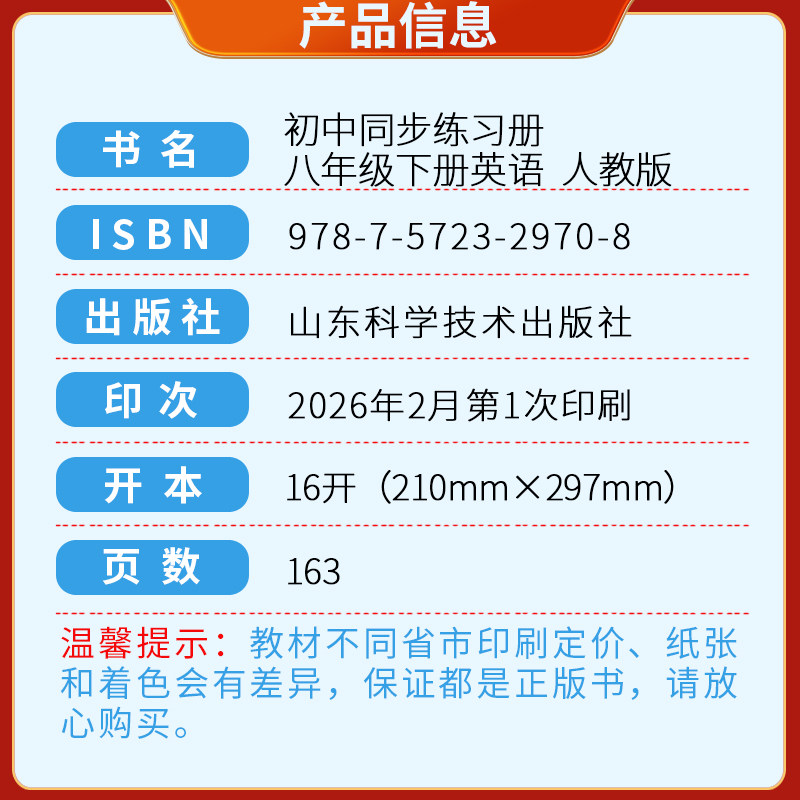 2026春新版《初中同步练习册·英语八年级下册》(配人教版·六三制)由山东科学技术出版社精心编写,严格依据最新课程标准及人教版教材内容设计。本书紧扣教材知识点,题型丰富多样,注重基础巩固与能力提升相结合,涵盖听力、语法、阅读、写作等全方位训练。每单元设置“知识梳理”“同步精练”“拓展提升”等模块,帮助学生系统掌握重点难点,强化语言运用能力。题目难度循序渐进,贴近中考命题趋势,配有详细解析,便于学生自查自纠。本书旨在提升学生英语综合素养,是八年级学生同步学习、高效备考的理想辅助资料。