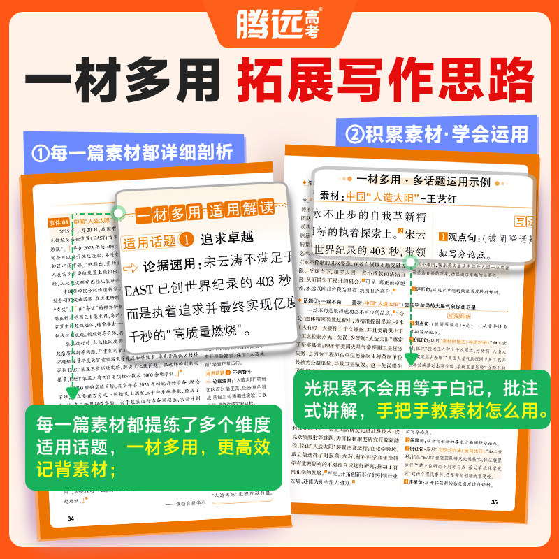 《腾远高考·2026高考语文作文素材书》由万唯教育精心打造,专为高中生作文冲刺设计。本书紧扣高考热点与常考主题,精选最新时事、经典人物、哲理故事等优质素材,涵盖家国情怀、科技创新、文化传承、青年担当等高频考点。书中提供“万能素材”“高分语段”“金句积累”及“好词好句摘抄”,搭配高考高分范文解析,帮助学生快速构建写作思路,提升语言表达力。内容系统实用,排版清晰,便于日常积累与考前突击,是高中生备战高考作文的得力助手,助力考生在考场上写出立意深刻、文采斐然的高分作文。