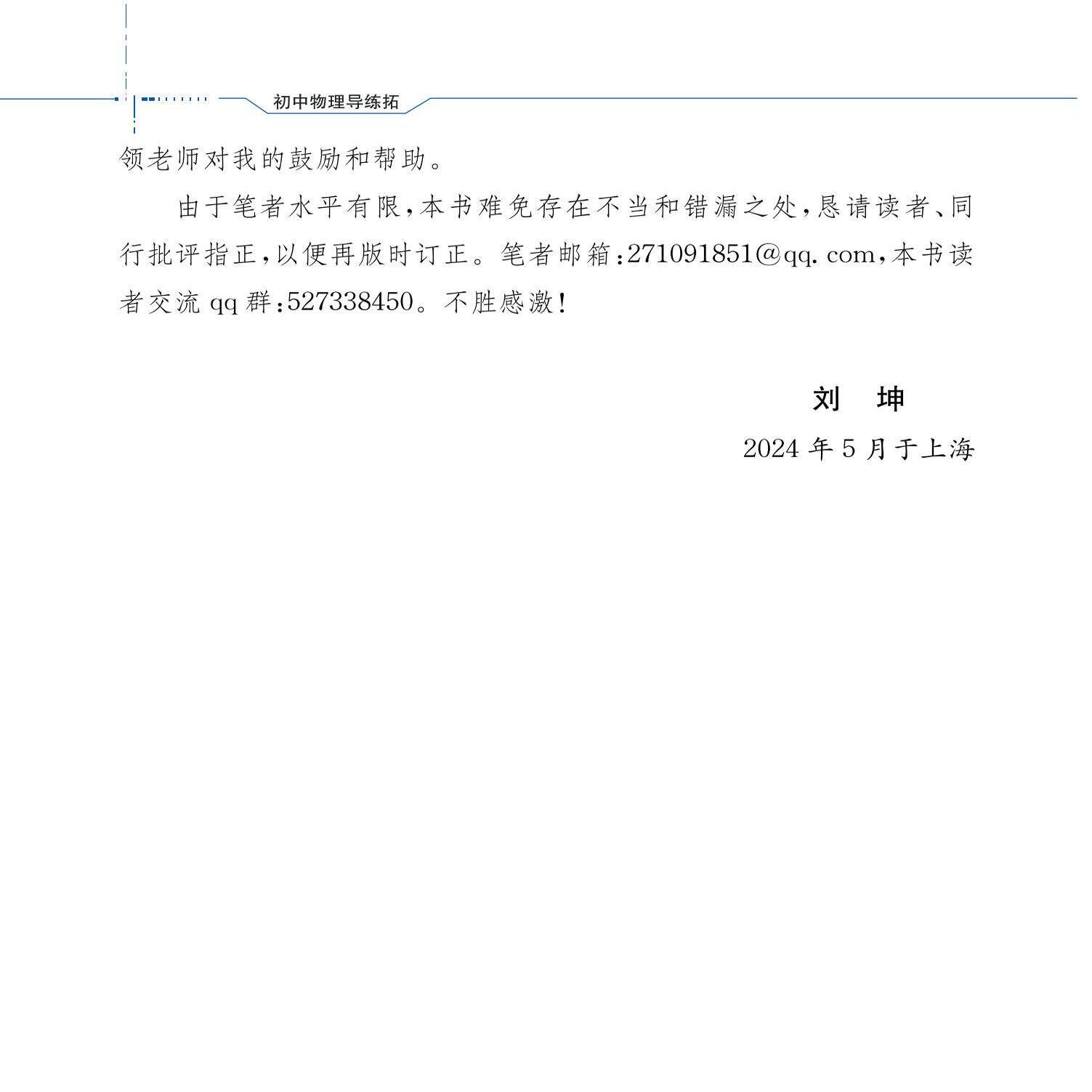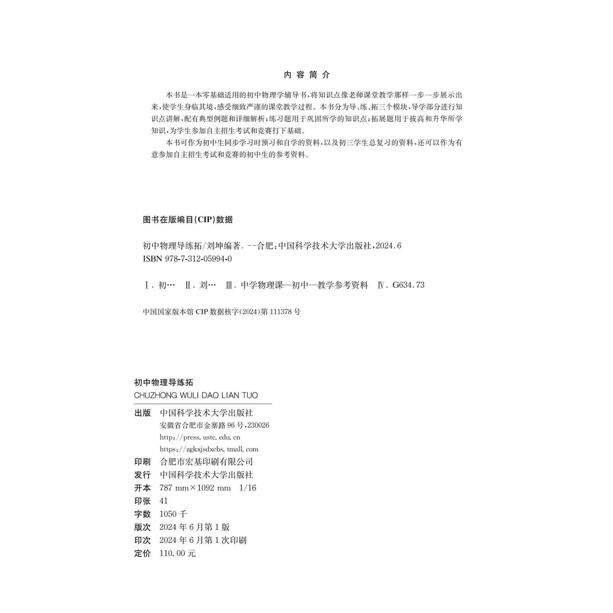 《初中物理导练拓》由刘坤编著,是一本紧扣初中物理大纲与中考考点的权威辅导书。本书系统梳理了初中物理核心知识点,涵盖声、光、力、热、电等模块,结构清晰,重点突出。结合教材同步练习,强化基础,提升解题能力。书中精选典型例题,详解解题思路,并附大量中考真题及模拟题,帮助学生掌握刷题技巧,突破重难点。由中国科学技术大学出版社出版,内容科学严谨,适合初中生同步学习与中考复习使用,是提升物理成绩的高效学习工具。