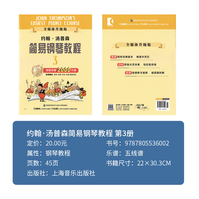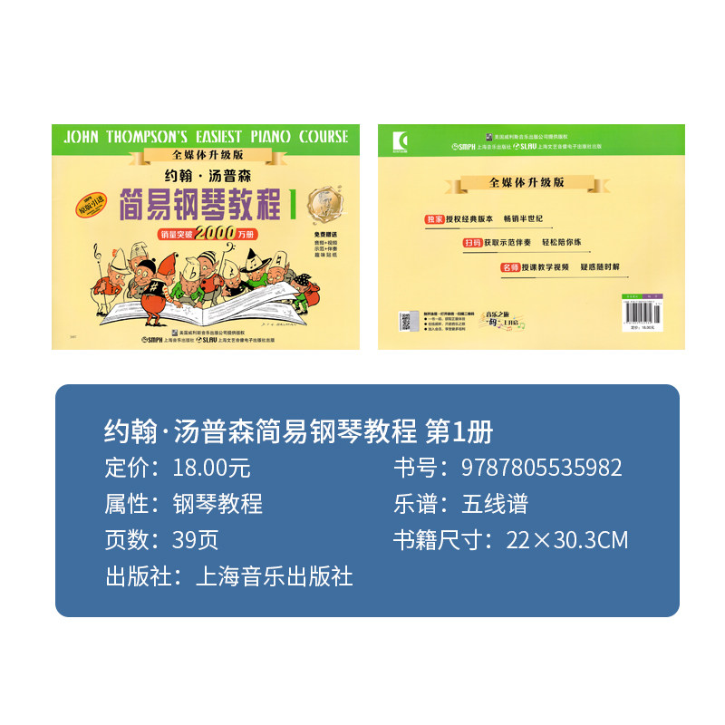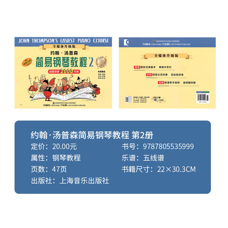 《小汤姆森简易钢琴教程》(小汤1-3册)是约翰·汤普森专为儿童钢琴初学者设计的经典入门教材,适合零基础少儿自学或课堂教学使用。教材采用循序渐进的方式,从认识五线谱、手位练习到简单旋律演奏,内容生动有趣,搭配丰富的插图和练习曲,激发孩子学习兴趣。每首曲子短小精悍,易于上手,帮助孩子快速建立信心。特别推出“买书赠视频”活动,随书附赠专业教学视频,直观演示指法、节奏与演奏技巧,让自学更高效。无论是家长辅导还是孩子独立练习,这套教材都是开启钢琴音乐之旅的理想选择,为后续学习打下坚实基础。