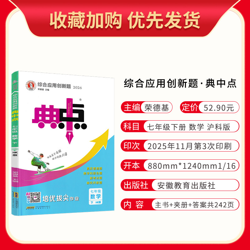沪科版2026春《典中点》七年级下册数学(HK版)是由荣德基主编、上海科学技术出版社出版的初中数学同步练习册。本书紧扣沪科版教材,系统梳理七年级下册数学知识要点,题型丰富、梯度合理,涵盖基础巩固、能力提升与思维拓展三大板块。精选典型例题,注重解题方法与思路引导,辅以课时训练、章末检测和综合测评,帮助学生夯实基础、提升综合运用能力。内容编排科学,讲练结合,适合学生课后巩固与教师教学参考,是七年级学生高效学习数学的优质辅导资料。