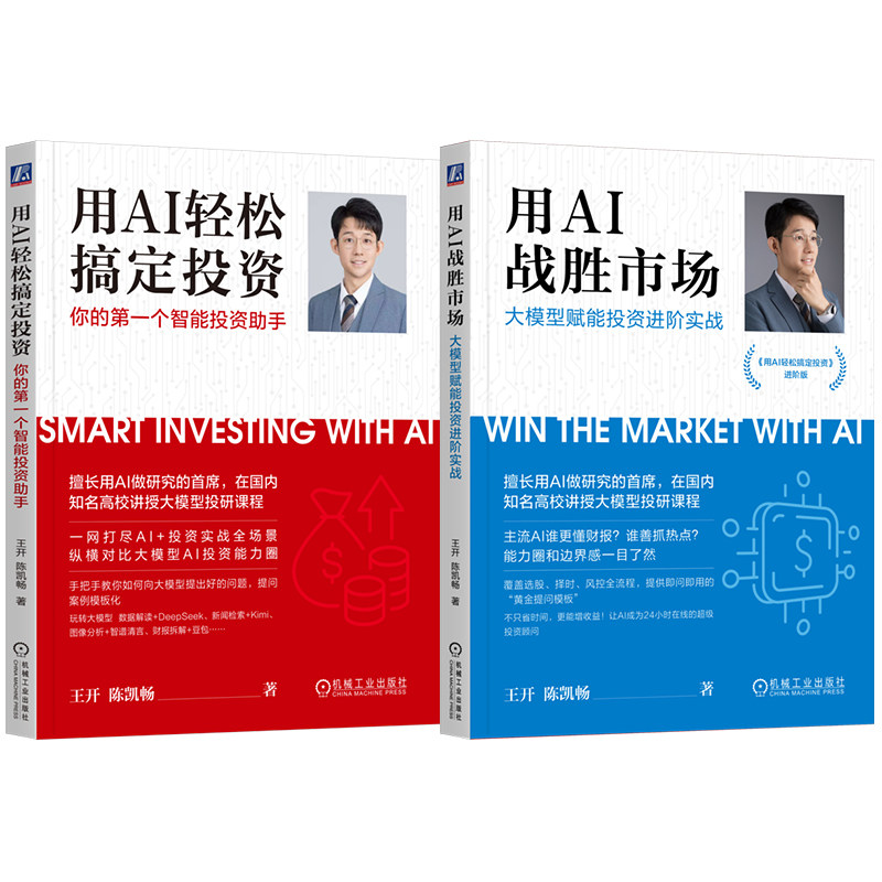 《AI战胜市场+用AI轻松搞定投资》套装全2册,是一套专为现代投资者打造的AI赋能投资指南。本书结合人工智能技术与金融投资实战,系统讲解AI在资产配置、智能投顾、市场预测等领域的应用,帮助读者掌握前沿投资工具与策略。通过通俗易懂的教程,读者可快速理解AI如何优化投资组合、降低风险、提升收益。无论你是投资新手还是资深理财者,这套书都能助你轻松驾驭AI金融时代,实现智能化、高效化的财富管理,真正让AI成为你的投资助手,开启轻松理财新篇章。