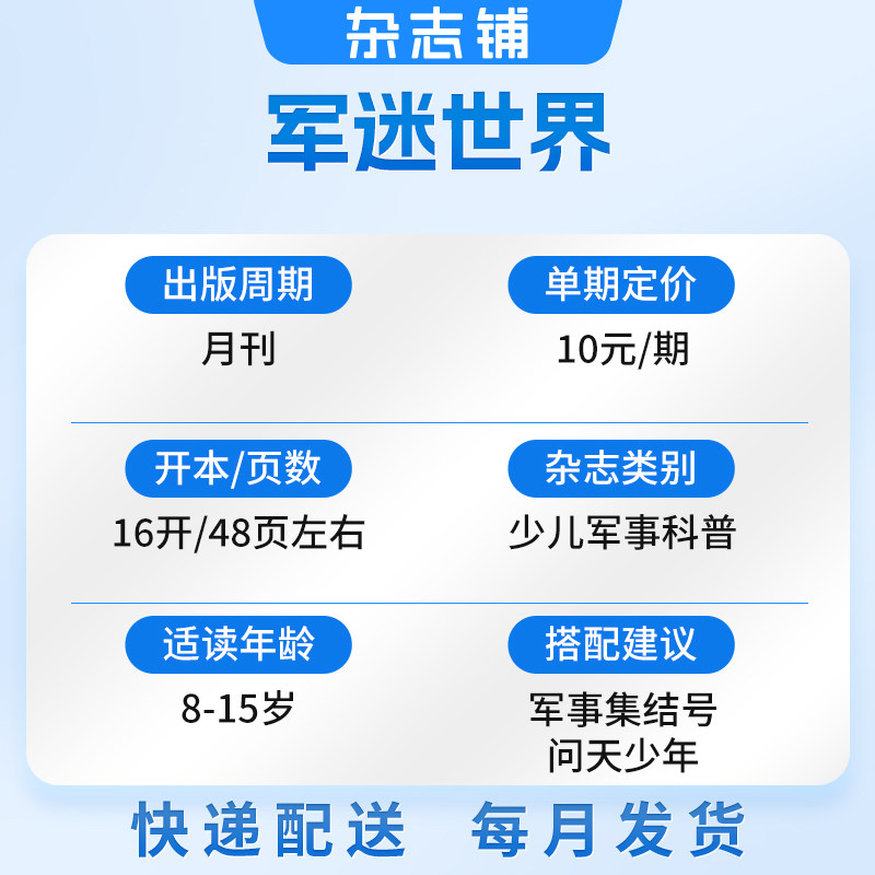 【送好礼】军迷世界杂志订阅,从2026年1月起订,为期一年共12期。这是一本深受军事爱好者喜爱的科普期刊,涵盖军事知识、科技信息和少儿科普内容。它带你深入了解军事领域的最新动态和科技进展,是军事迷们不可或缺的阅读选择。由中少出版,品质有保障,让你在阅读中收获知识,享受阅读的乐趣。杂志铺推荐,不容错过的好礼!