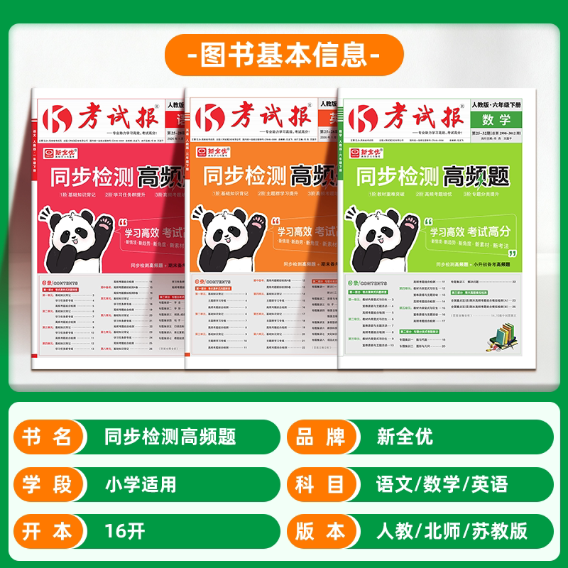 《2026考试报·同步检测高频题》专为小学一至六年级学生设计,紧扣各年级上册语文、数学、英语教材重点,精选高频考点与典型题型,助力学生高效巩固所学知识。丛书融合“新全优少年素质教育”理念,注重基础夯实与能力拓展相结合,通过“高效学习周计划”安排,帮助学生科学规划复习节奏,提升学习效率。内容涵盖单元检测、专项训练与综合模拟,题型灵活、难度适中,既强化应试能力,又培养核心素养。是学生日常练习、考前集训的理想辅导资料,助力孩子在学业上稳步提升,成就全面发展的优秀少年。