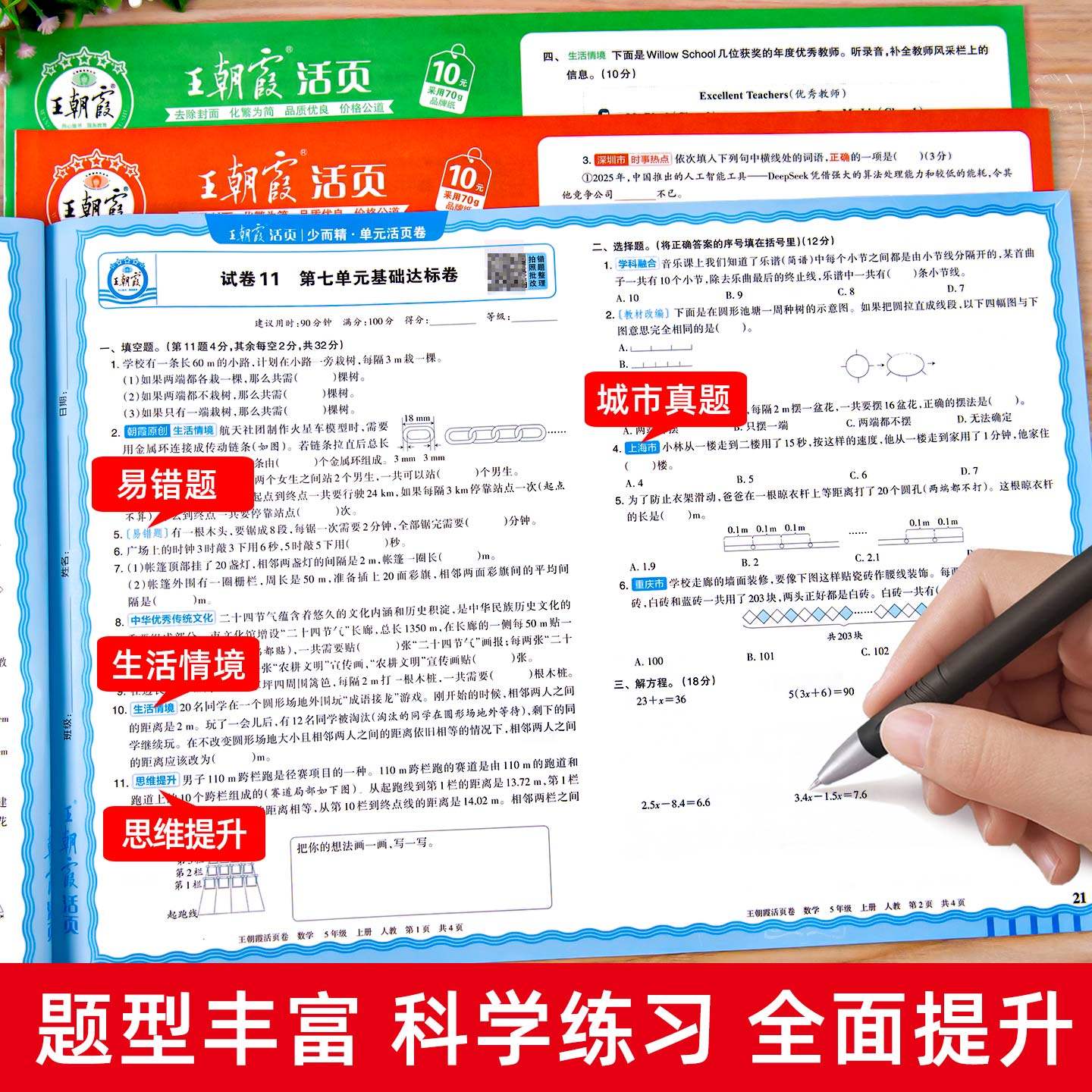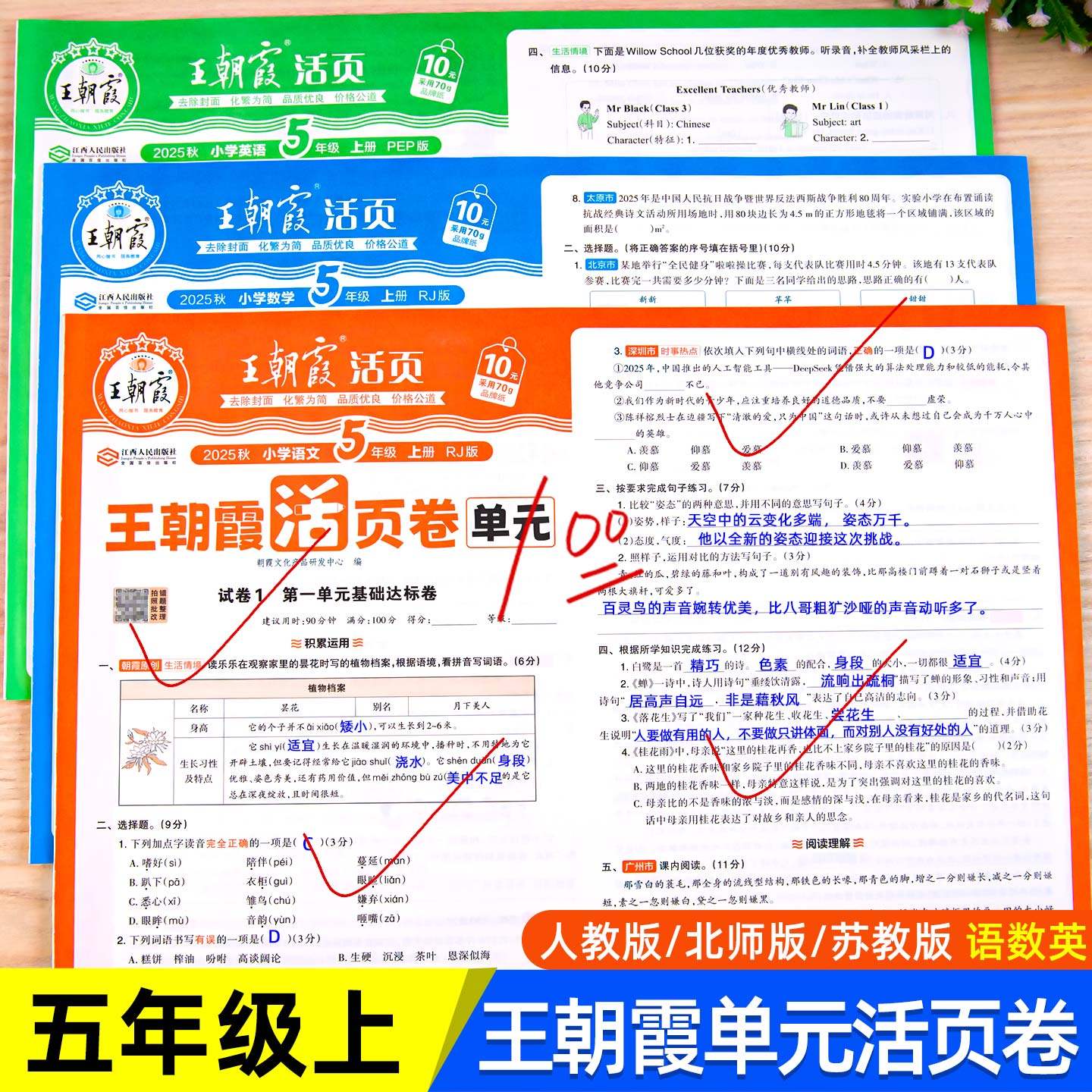 2025秋五年级上册《王朝霞试卷》全套涵盖语文、数学、英语三科,紧密同步人教版、北师大版、苏教版等主流教材,专为小学五年级学生设计。试卷包含单元活页卷、期中、期末冲刺卷,题型丰富,难度适中,紧扣新课标要求,注重基础知识巩固与综合能力拓展。每套试卷结构清晰,题量合理,便于学生随堂检测与阶段性复习。活页设计方便撕取,适合课堂练习、家庭作业及考前模拟。王朝霞试卷以精准命题、科学编排著称,帮助学生查漏补缺,提升应试能力,是五年级学生高效学习的得力助手。