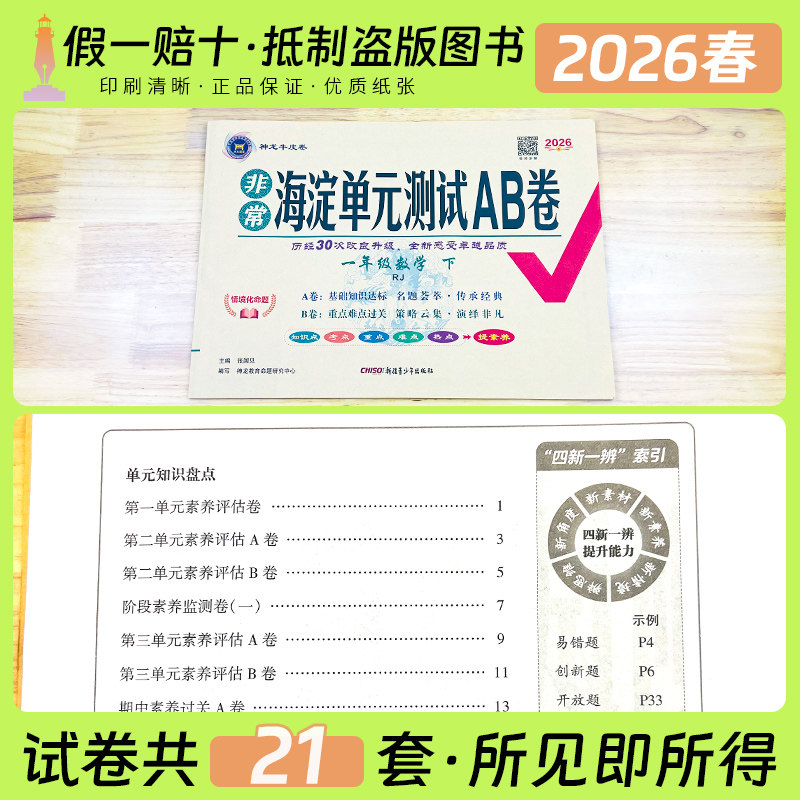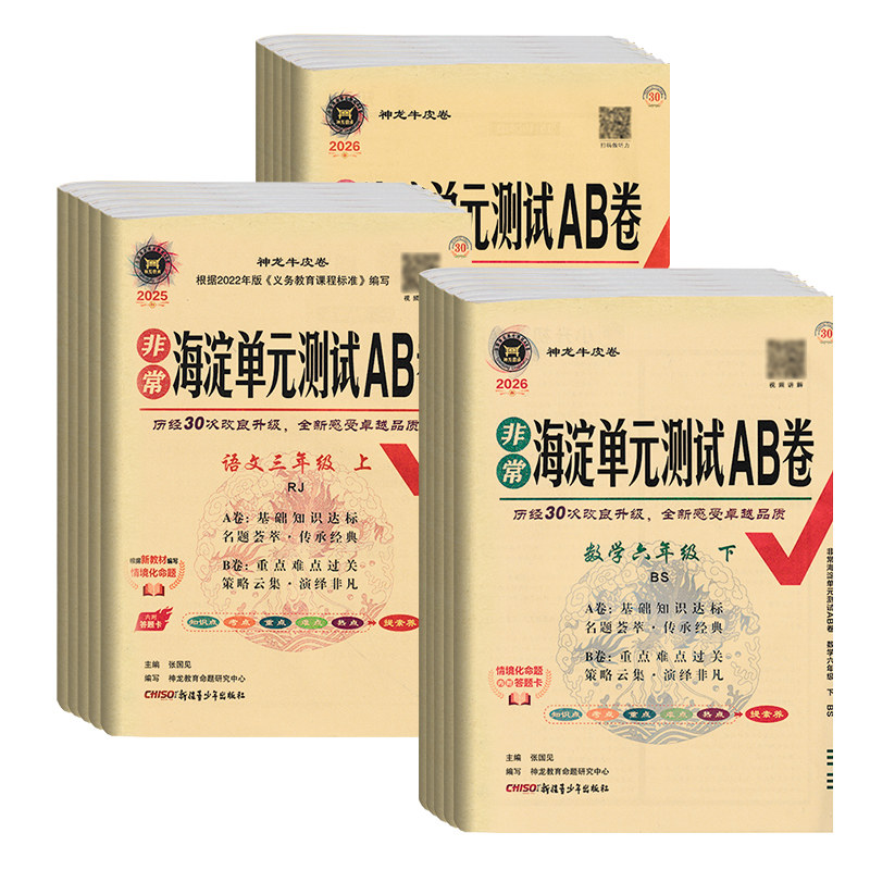 2026春《非常海淀单元测试卷AB卷》专为小学一至六年级学生设计,涵盖语文、数学、英语三科,适配人教版、青岛版、北师大版、苏教版、外研版及五四制等多种教材版本。试卷分单元测试卷(A、B卷)、期中期末综合卷及期末冲刺卷,题型全面,难度分层,注重基础知识巩固与能力提升。A卷侧重基础训练,B卷强化拓展应用,帮助学生系统复习、查漏补缺。内容紧扣新课标,贴近考试实际,是学生阶段性检测与期末高效复习的理想资料,助力学生夯实基础、冲刺高分。