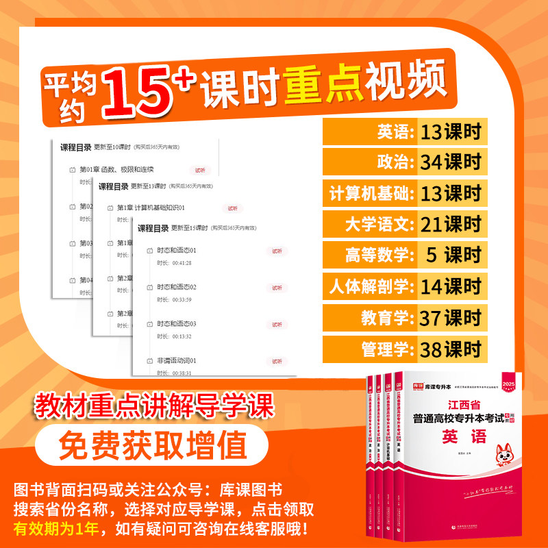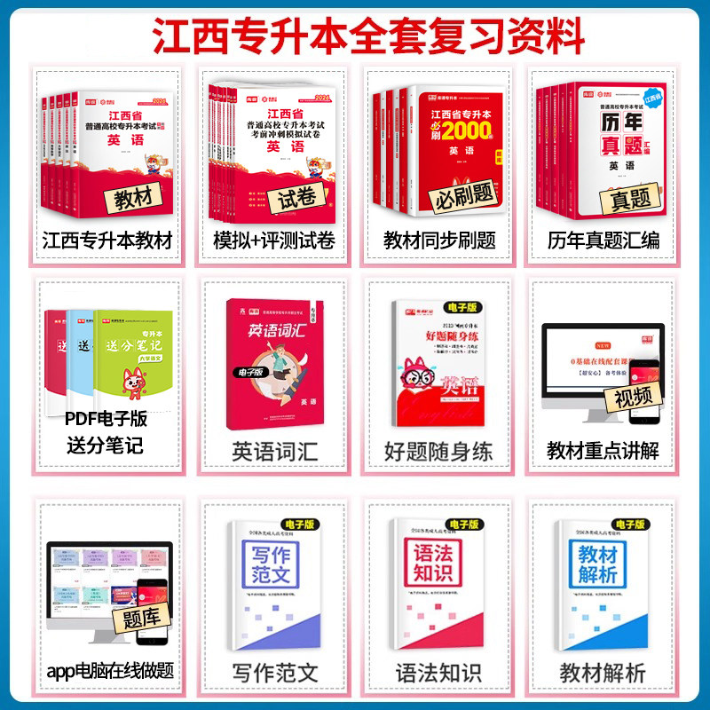 现货库课2026江西专升本系列资料,专为江西省专升本考生量身打造,涵盖英语、政治、计算机、管理学、语文、高等数学、信息技术等全科目复习资源。包含最新版教材、必刷2000题、历年真题卷及详细解析,紧扣考纲,精准覆盖高频考点。配套词汇专项训练与系统网课,帮助考生夯实基础、强化提升。题库按章节分类,讲练结合,适合不同阶段复习需求。历年真题还原真实考试场景,助力掌握命题规律。资料全面、权威实用,是江西专升本考生高效备考的优选工具,助力考生一战上岸,圆梦本科。适合自学与辅导同步使用,全面提升应试能力。