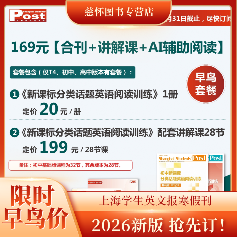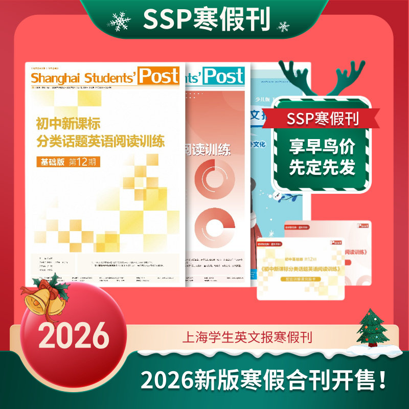 2026寒假刊订阅火热开启!SSP上海学生英文报纸寒假专刊,专为中高考学子打造,精选初中英语与高中外刊时文,紧扣考试热点,助力阅读能力提升。本期特设GVC(语法、词汇、语境)专项训练,涵盖首字母填空、完形填空等高频题型,精析解题技巧,强化语言综合运用能力。配套写作指导课程,提供高分范文与实用表达,全面提升英语应试水平。内容权威、设计科学,是寒假高效复习的理想选择。订阅即享优质学习资源,助力学子在假期实现英语突破,为中高考打下坚实基础!