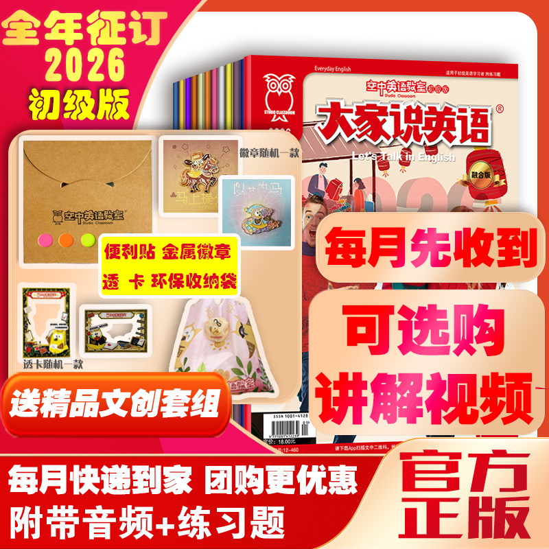 《大家说英语》杂志视频版(空中英语教室初级版)2025年10月至12月刊,专为英语入门学习者设计,适合中小学生、初中生及英语基础较薄弱者。内容涵盖日常口语、实用美语表达和生活场景对话,语言简洁生动,搭配高清视频讲解,帮助学习者在真实语境中掌握基础词汇与句型。每月主题贴近校园与家庭生活,如问候、购物、交通等,辅以发音指导和互动练习,有效提升听说能力。2026年1月特别推出年度回顾与学习规划专题,助力巩固全年所学,是英语启蒙与日常口语提升的理想学习资源。