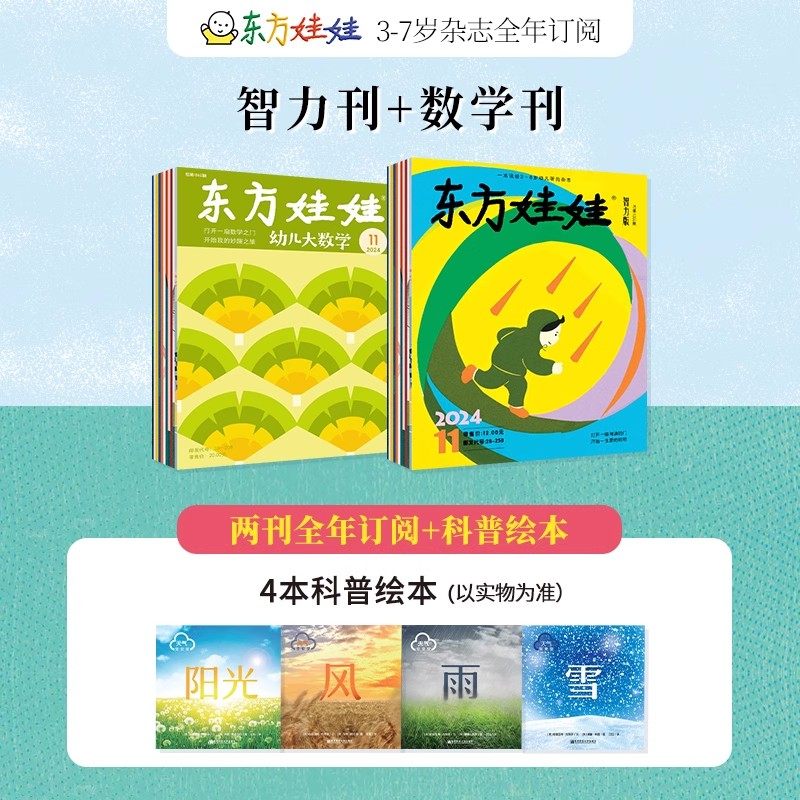 《东方娃娃·婴儿版》2025/2026全年订阅,专为0-3岁宝宝精心打造,共12期24本,包含《东方宝宝》智力刊与绘本刊。智力刊融合认知启蒙、感官训练与语言发展,通过趣味游戏、生活情境和互动设计,激发宝宝探索欲;绘本刊精选国内外优质图画书,主题温暖治愈,画面柔和,语言简洁,适合亲子共读与睡前故事。每期内容科学适龄,兼顾趣味性与教育性,助力宝宝早期智力、情感与语言能力全面发展。高品质环保印刷,圆角设计安全贴心,是家庭早教、亲子陪伴的理想读物,陪伴宝宝快乐成长每一步。