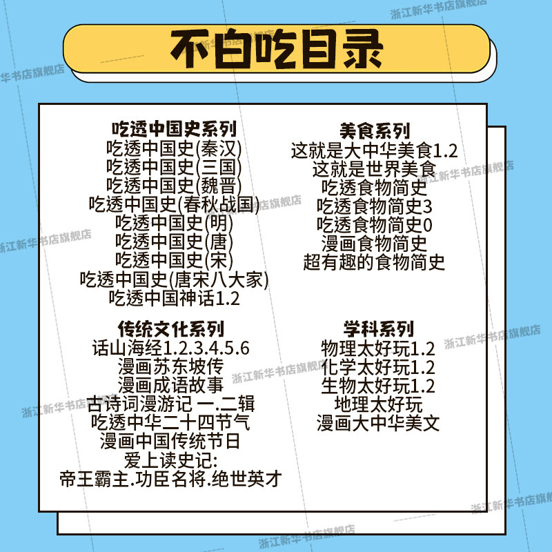 【新华书店】推出的“不白吃漫画书”系列,以趣味漫画形式讲述中华文化与历史,深受青少年喜爱。《我是不白吃》用轻松幽默的方式解读《山海经》,带你走进奇幻的上古世界;《吃透中国史》系列涵盖唐宋八大家、唐、明、宋、秦、汉、三国等朝代,将历史人物与美食巧妙结合,寓教于乐;《不白吃话山海经》6册更是图文并茂,还原神话异兽与地理风貌。全系列融合大中华美食与世界各地风味,在“吃”中读懂历史,在趣味中传承文化,是一套集知识性、趣味性与收藏性于一体的优质童书,适合全家共读。