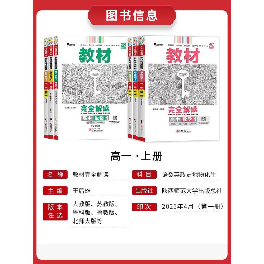 《2026王后雄教材完全解读》是一套专为高一学生设计的高效学习辅导丛书,涵盖语文、英语、数学、物理、化学、生物、政治、历史、地理等九大学科,全面对应必修第一、二、三册课本内容。本书紧扣新课标与高考考纲,系统梳理教材知识点,突出重点难点,配以典型例题与解析,帮助学生夯实基础、提升能力。每章设有知识框架、考点突破、易错警示和真题链接,讲练结合,强化理解与应用。内容编排科学,语言精炼,适合课前预习、课堂同步学习与课后复习,是高一学生掌握核心知识、提升学业成绩的理想工具书。