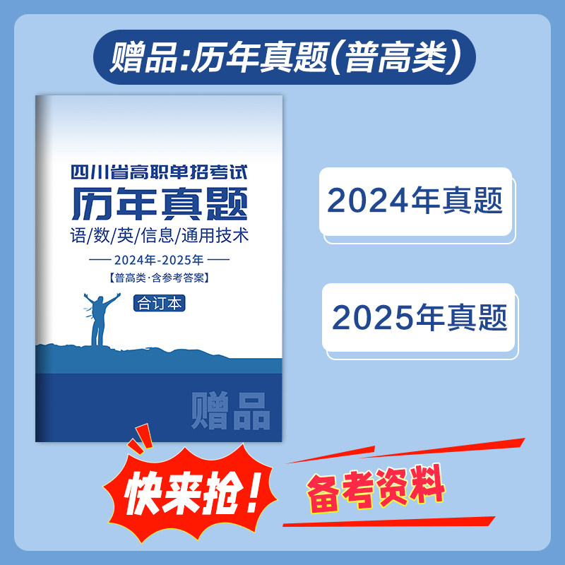 2026年四川高职单招考试复习资料,专为考生量身打造,涵盖语文、数学、英语、通用技术与信息技术五大科目。本套资料包含全套高清网课视频,名师精讲考点,直击考试重难点;附赠近五年历年真题及详细解析,帮助考生熟悉题型、掌握命题规律。同时配备《四川单招冲刺卷》,模拟实战演练,提升应试能力。内容紧扣最新考试大纲,知识点全面、讲解清晰,适合基础薄弱至冲刺拔高各阶段考生使用。无论是自学备考还是配合培训,都能高效提分,助力考生顺利考入理想高职院校。一书在手,备考无忧!