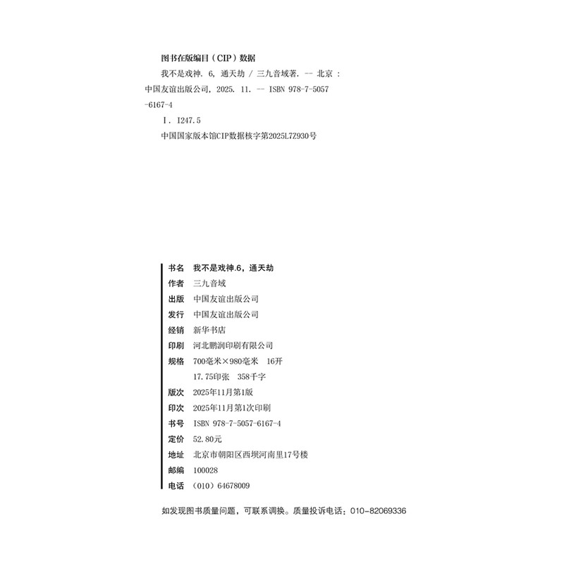 《我不是戏神6:通天劫》是三九音域创作的惊悚悬疑推理无限流小说《夜幕之下》系列的第六部。故事延续一贯的诡谲氛围与高能节奏,主角在“通天劫”副本中直面命运抉择,穿梭于虚实交错的界域之间。书中融合东方玄学与克系悬疑,剧情层层反转,真相藏于细节之中。随书附赠“通天星位赛事通知单”“天枢界域通缉令折页”“时代存档鬼嘲书签卡”三件实体周边,沉浸式还原书中世界观,增强阅读体验。本作不仅是一场智识博弈,更是一次对人性与宿命的深刻叩问,是无限流爱好者不可错过的巅峰之作。