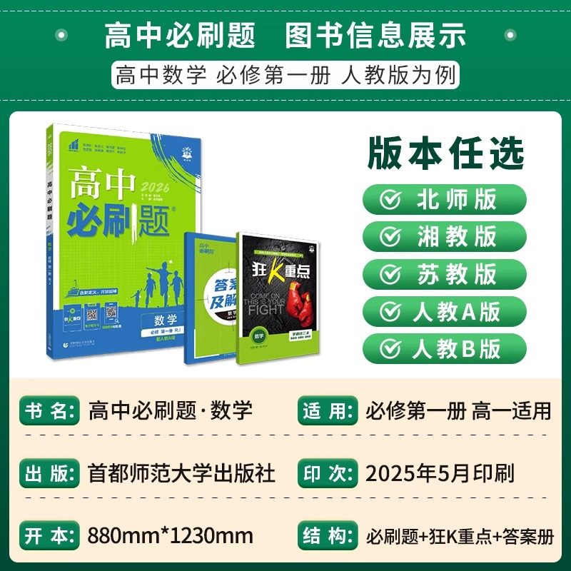 2026版《高中必刷题》高一上学期必修第一、二册(人教版新教材)同步练习册,涵盖数学、物理、化学、生物、政治、历史、地理、英语等学科,紧扣新课标与教材单元内容,科学分层训练。试题精选典型例题与高考真题改编题,注重基础巩固与能力提升并重,辅以详细解析与思路点拨,帮助学生夯实知识、掌握方法、提升素养。理想树系列品质保障,排版清晰,答案独立成册,便于自测与复习。适用于高一学生同步学习与阶段性检测,是高效提分的优质教辅资料。