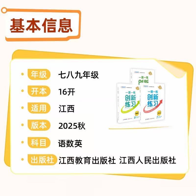 《2025秋一课一练·创新练习标准版上册》语文系列,专为初中7-9年级学生设计,涵盖初一至初三全阶段,严格对标人教版教材,同步商务星球版教学进度。本书由江西教育出版社出版,紧扣新课标要求,精选典型例题,分层设置基础巩固、能力提升与拓展探究题型,注重知识迁移与思维训练。每课一练,讲练结合,帮助学生夯实基础、突破重难点。题目设计新颖,贴近生活实际,兼顾趣味性与实用性,助力学生高效掌握语文知识,提升综合素养。是初中生课前预习、课后复习的理想同步练习册。