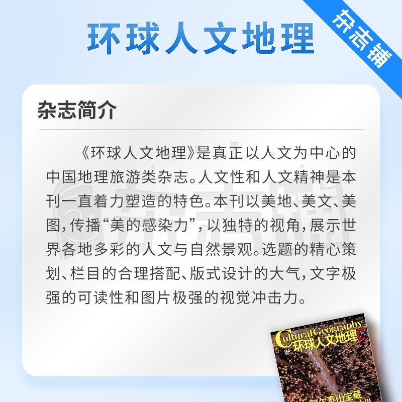 《环球人文地理》杂志2026年1月起订,全年共12期,由杂志铺提供全年订阅服务。该刊以深度探索世界人文景观、自然风貌与地域文化为核心,融合地理、旅游、民俗与摄影艺术,展现全球多元文化魅力。每期精选国内外独特目的地,通过专业视角与精美图文,带领读者领略山川湖海背后的历史故事与风土人情。内容兼具知识性与观赏性,适合热爱旅行、关注文化差异与地理探索的读者。订阅即享包邮到家,全年持续更新,是拓展视野、规划旅程的理想读物。无论是地理爱好者还是旅行达人,这本期刊都将为您打开一扇了解世界的窗口。