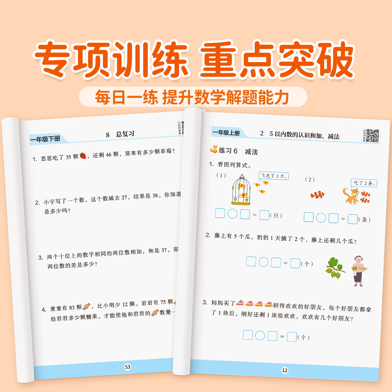 《一年级上下册数学应用题专项训练》是人教版专为幼升小及一年级学生设计的思维训练练习册,紧扣教材知识点,注重幼小衔接。本书精选贴近生活的应用题,涵盖加减法、比较、分类、图形认知等核心内容,通过图文结合的形式,帮助孩子理解题意,提升解决问题的能力。题目由浅入深,融入奥数启蒙思维,培养逻辑推理与数学表达力。每日一练,强化训练,巩固课堂所学,激发学习兴趣,为小学数学学习打下坚实基础。适合家庭辅导与课后练习,是提升一年级学生数学综合能力的实用工具书。