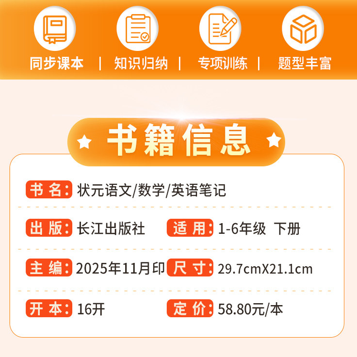 现货2026春小学《状元笔记》系列,涵盖语文、数学、英语全学科,适用于人教版、北师大版、江苏教版等主流教材版本,包含一至六年级上下册内容。该书紧扣课本知识点,系统梳理重点难点,配有清晰的知识框架、例题解析与随堂练习,是学生课前预习、课堂笔记补充和课后复习的高效辅导工具。内容编排科学,图文并茂,注重思维引导与能力培养,帮助小学生夯实基础、提升学习效率。随书附赠预习单,助力自主学习,是家长辅导、学生自学的优选资料。