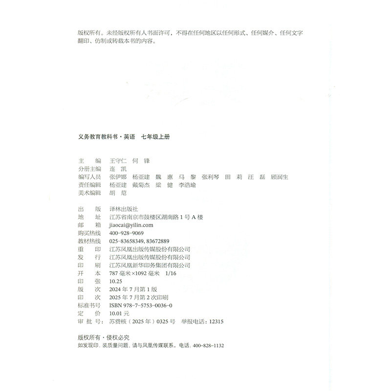 江苏译林版《英语》七年级上册是依据国家课程标准编写、由译林出版社出版的正规教材,适用于初中一年级学生。本书内容系统、结构清晰,注重听说读写综合语言能力的培养,话题贴近学生生活,如学校生活、家庭、兴趣爱好等,激发学习兴趣。教材配有丰富的插图、练习和互动活动,注重语言实践与交际能力的提升。词汇、语法循序渐进,符合七年级学生的认知水平。作为新华正版书籍,内容权威、印刷精良,是初中英语教学的重要依托,广泛应用于江苏省及全国多地中学,深受师生好评。