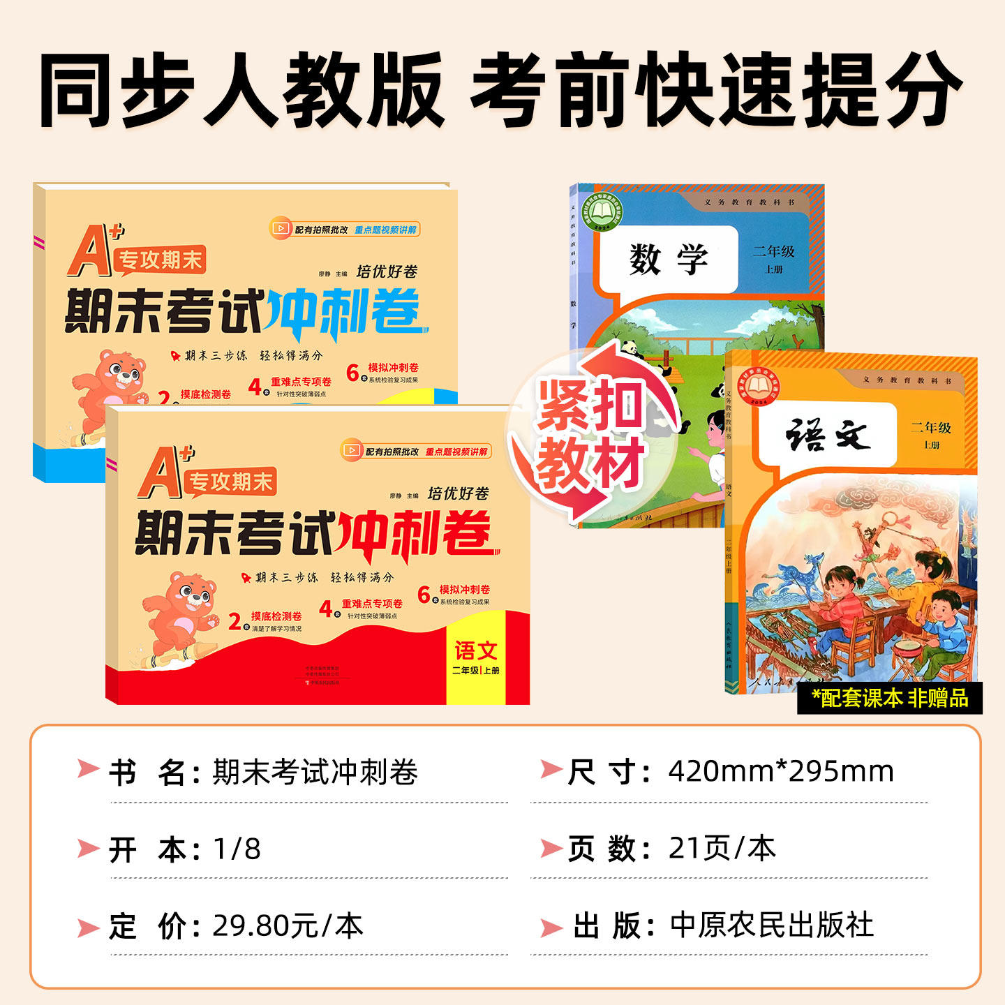 《2025秋季期末考试冲刺卷》二年级上册语文数学(人教版)专为小学二年级学生期末复习精心编写。试卷紧扣教材重点难点,涵盖字词积累、句子运用、阅读理解及数学计算、图形认知、应用题等核心知识点,题型全面,难度适中。通过专项训练与综合测试相结合的方式,帮助学生系统梳理知识体系,查漏补缺,提升应试能力。每套试卷均模拟真实考试场景,配有详细答案解析,便于家长辅导和孩子自主复习。助力学生在期末考试中取得优异成绩,冲刺100分,夯实学习基础,增强学习信心。