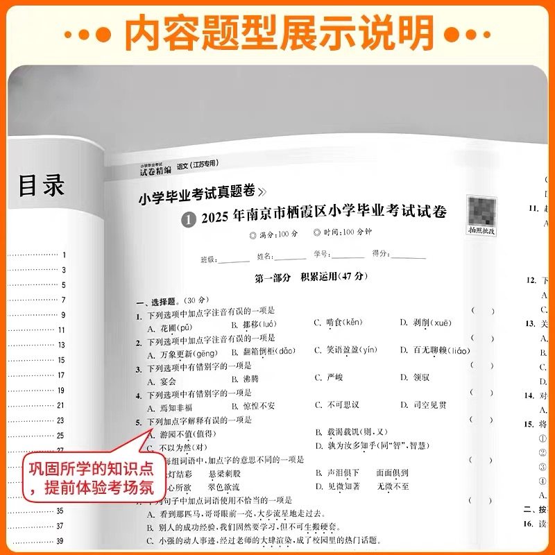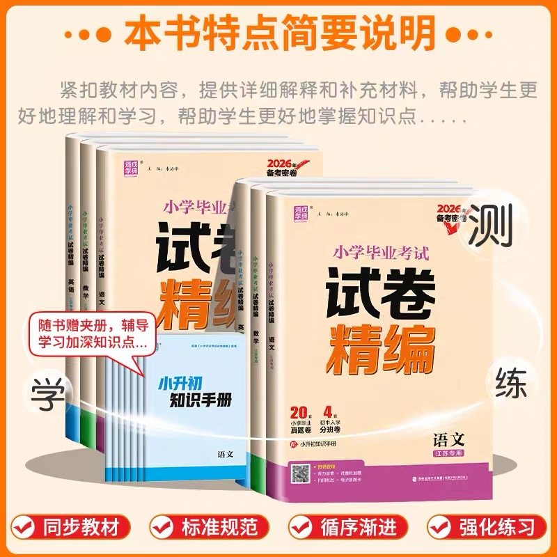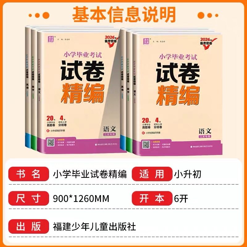 《2026备考密卷·通城学典小学毕业考试试卷精编》(江苏专用)是一套专为江苏地区小升初考生打造的三科套装,包含语文、数学、英语共24份高质量模拟试卷。试卷紧扣江苏省最新课程标准与考纲要求,精选历年真题与典型题型,难度贴近真实毕业升学考试。内容涵盖全面,题型新颖,注重基础知识巩固与综合能力训练,帮助学生系统复习、查漏补缺。每套试卷均附详细解析,便于学生自测自评,提升应试技巧。本套试卷是2025年江苏省真题的延续与升级,助力考生高效备考,从容应对2026年小升初考试,是小学毕业生冲刺理想中学的得力助手。