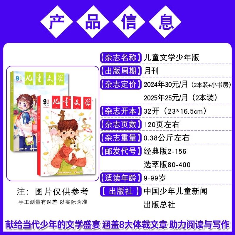 《儿童文学》杂志少年版(2025年1-12月+2026年全年/半年可选)是专为小学中高年级至初中生打造的优质文学期刊。精选“经典”“选萃”“小书房”三大版块,内容涵盖名家名作、同龄佳作、作文技法与阅读素材,语言优美、思想积极,兼具文学性与教育性。2024年现货过刊,可提前阅读积累素材,助力写作提升与审美培养。每月一辑,陪伴孩子成长,激发阅读兴趣,拓宽视野。无论是语文学习、作文备考,还是心灵滋养,都是理想之选。订阅全年或半年,轻松获取持续优质内容,是家长与学校广泛推荐的青少年阅读好伙伴。