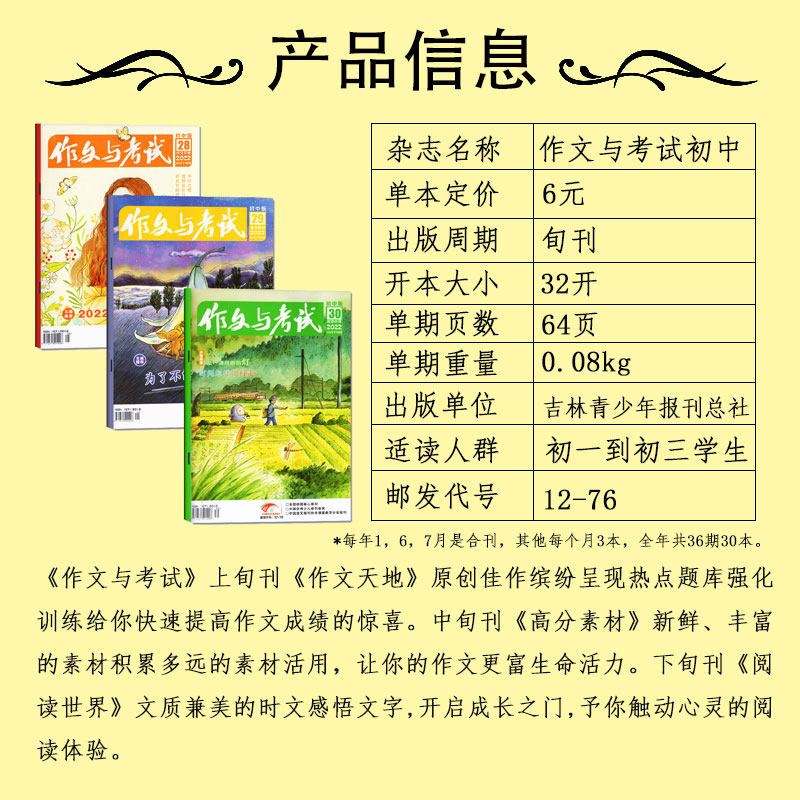 《作文与考试·初中版》2026年1月新期现已推出,专为初中生打造,助力中考备考与写作提升。本期涵盖2025年1—12月全国中考真题解析,精准提炼考点,强化应试能力;精选优质作文素材,拓展写作思路;同步提供全年、半年、季度订阅及增刊服务,灵活满足学习需求。杂志内容紧贴课标,融合阅读与写作训练,精选名家美文与同龄佳作,提升语言素养与表达能力。无论是日常积累还是考前冲刺,都是中学生提升语文成绩、丰富课外阅读的理想读物。订阅即享系统备考资源,让作文与考试不再成为难题。