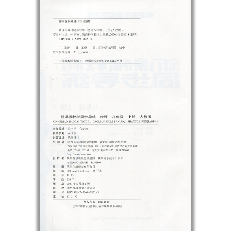 《新课标教材同步导练·物理八年级上册》(配人教版RJ)由陕西科学技术出版社出版,是与人民教育出版社初中物理教材完全同步的配套练习册。本书紧扣新课标要求,立足教材重点难点,精心设计分层训练题,涵盖基础知识巩固、能力提升拓展及中考真题链接,帮助学生夯实基础、提升思维。内容结构清晰,题型多样,配有详细解析,便于学生自主学习与教师课堂检测。适用于初二学生日常练习、课后复习及阶段性测评,是提升物理成绩、培养科学素养的优质教辅用书,助力学生高效掌握八年级上册物理核心知识。