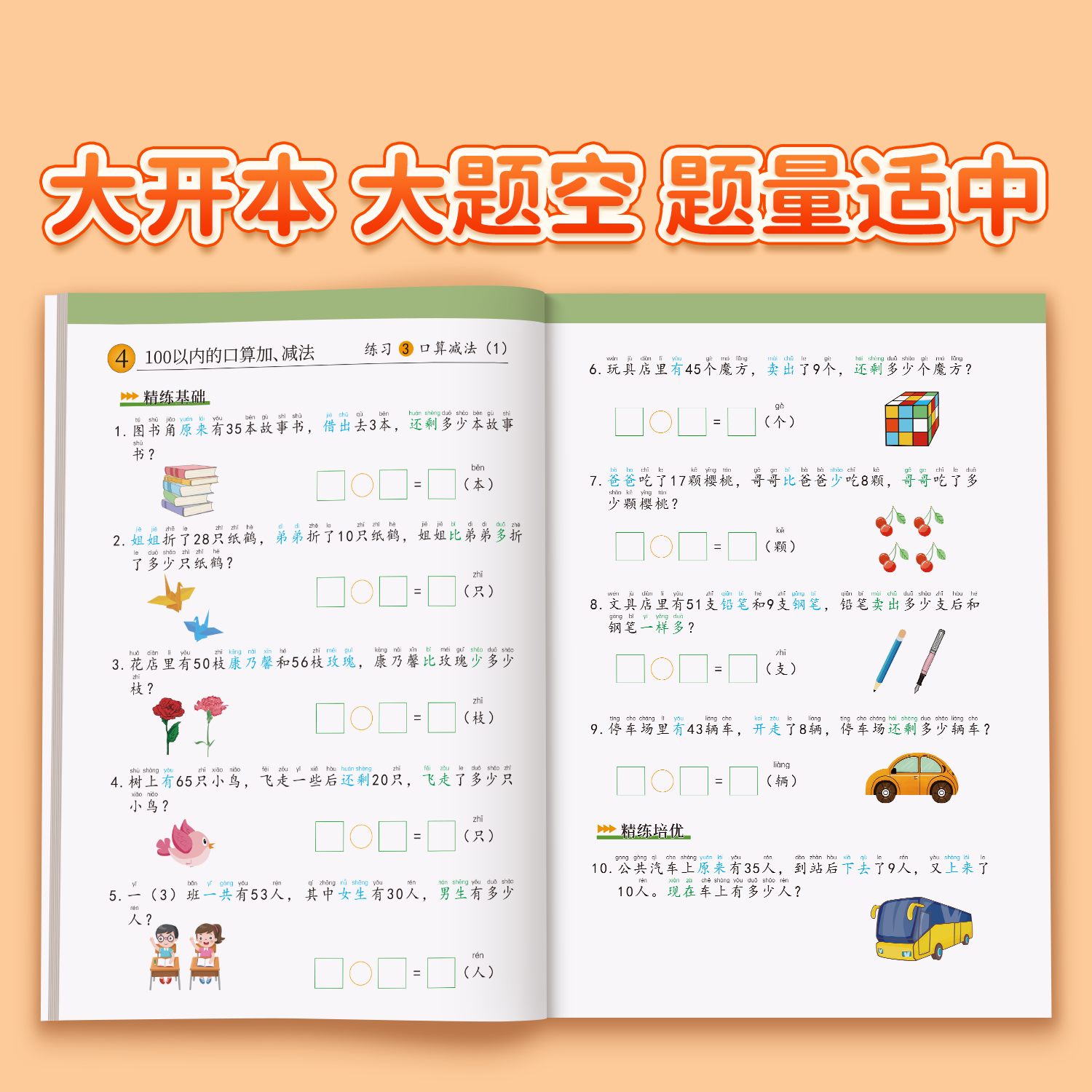 小学一二三年级上册下册数学口算天天练口算题卡竖式脱式应用题四合一计算题专项强化训练习题册一升二升三学口算每天一练思维训练