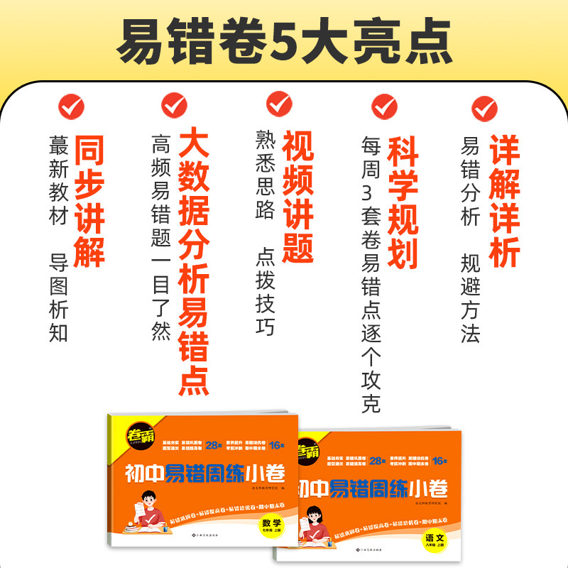 卷霸旗舰店2025版《初中易错周练小卷》专为七、八年级学生打造,涵盖数学、物理、化学、语文、英语、生物、道法、历史、地理九大学科,分上下册同步教材。精选历年真题及典型易错题型,以周测形式系统训练,帮助学生精准突破知识盲点,强化重点难点。每卷设专项训练与综合检测,题型新颖、难度适中,贴合新课标要求。配套详细解析,便于自查自纠,提升应试能力。适合初一、初二年级学生日常巩固与考前复习,是夯实基础、提分增效的高效学习工具。