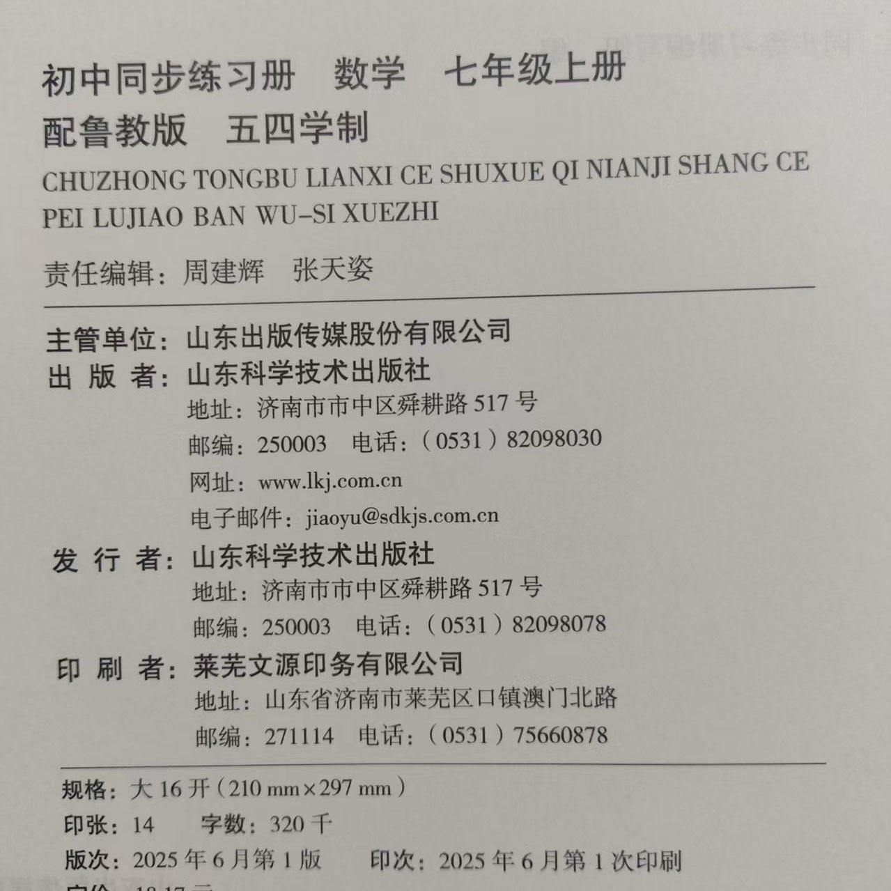 2025秋五四制鲁教版初中同步练习册《数学七年级上册》由山东科学技术出版社精心编写,严格依据山东省“五四学制”课程标准,与人教版教材同步配套。本书紧扣七年级数学上册知识点,涵盖有理数、整式的加减、一元一次方程、几何图形初步等重点章节,题型丰富,梯度合理,注重基础巩固与能力提升。每课时设置基础训练、综合拓展与中考链接,帮助学生夯实基础、拓展思维。答案详解详析,便于学生自查自纠。适用于山东地区五四制初中二年级(七年级)学生日常练习与复习使用,是提升数学成绩的理想辅助资料。