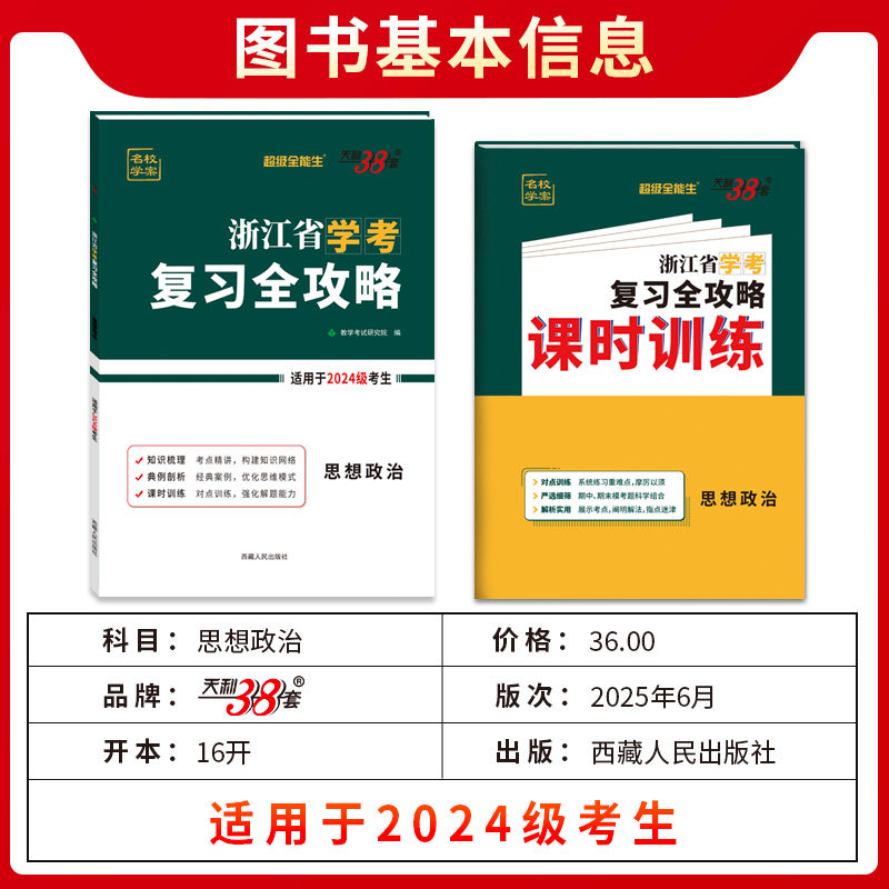 《2026版天利38套·浙江省高中学业水平考试复习全攻略》专为浙江考生量身定制,涵盖高一化学、地理、历史、生物及高二政治、物理、语文、技术、数学等科目,紧扣最新学考大纲与命题趋势。试卷精选典型真题与原创模拟题,题型全面、难度适中,注重基础知识巩固与能力提升并重。每套试卷均配有详尽解析,帮助考生查漏补缺、高效备考。本书结构清晰,讲练结合,是浙江高中生冲刺学考“A”等的权威复习资料,助力学生在7月学考中稳操胜券,实现学业目标。