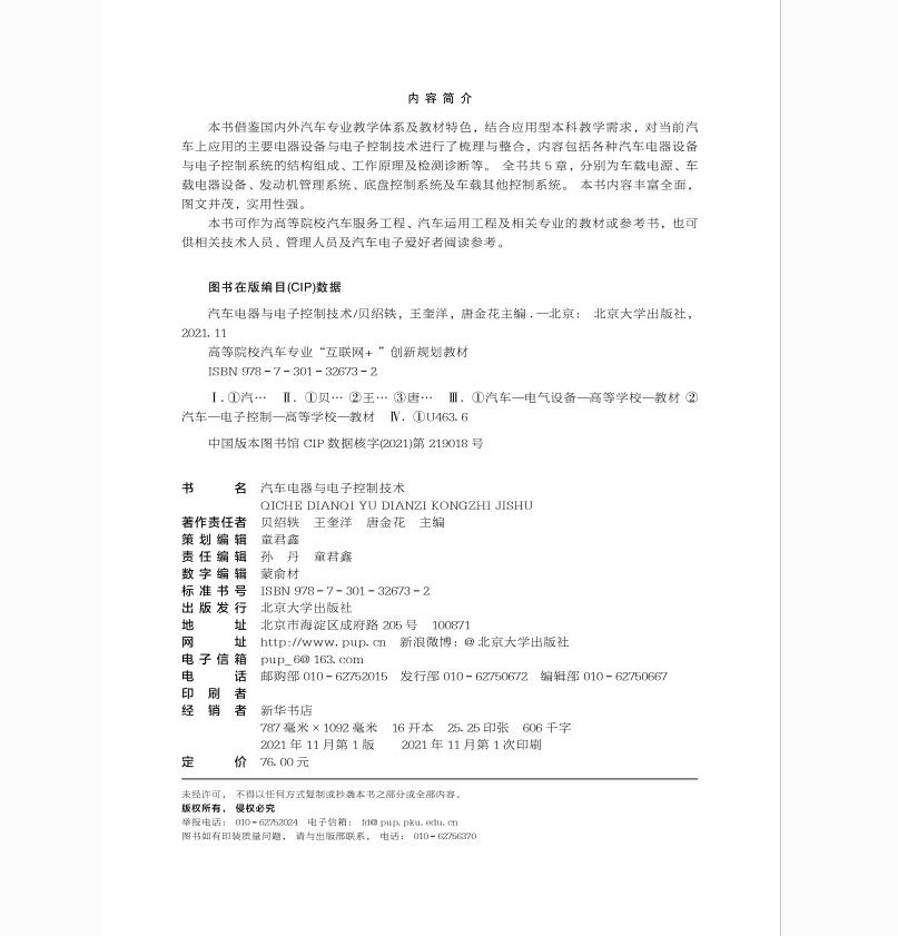 《汽车电器与电子控制技术》是面向高校汽车专业打造的“互联网+”创新教材,由北京大学旗舰店正版发行。本书紧跟汽车智能化、电动化发展趋势,系统讲解汽车电源系统、起动系统、点火系统、照明信号、辅助电器及现代电控技术等内容,融合传感器、ECU、CAN总线等核心技术。教材采用“纸质书+数字资源”模式,配套在线课程、虚拟仿真实验、AR互动案例及习题库,实现线上线下一体化学习。内容权威、结构清晰,注重理论与实践结合,适用于应用型本科及高职院校汽车类专业教学,助力学生掌握前沿汽车电子技术,提升工程实践能力与创新思维。