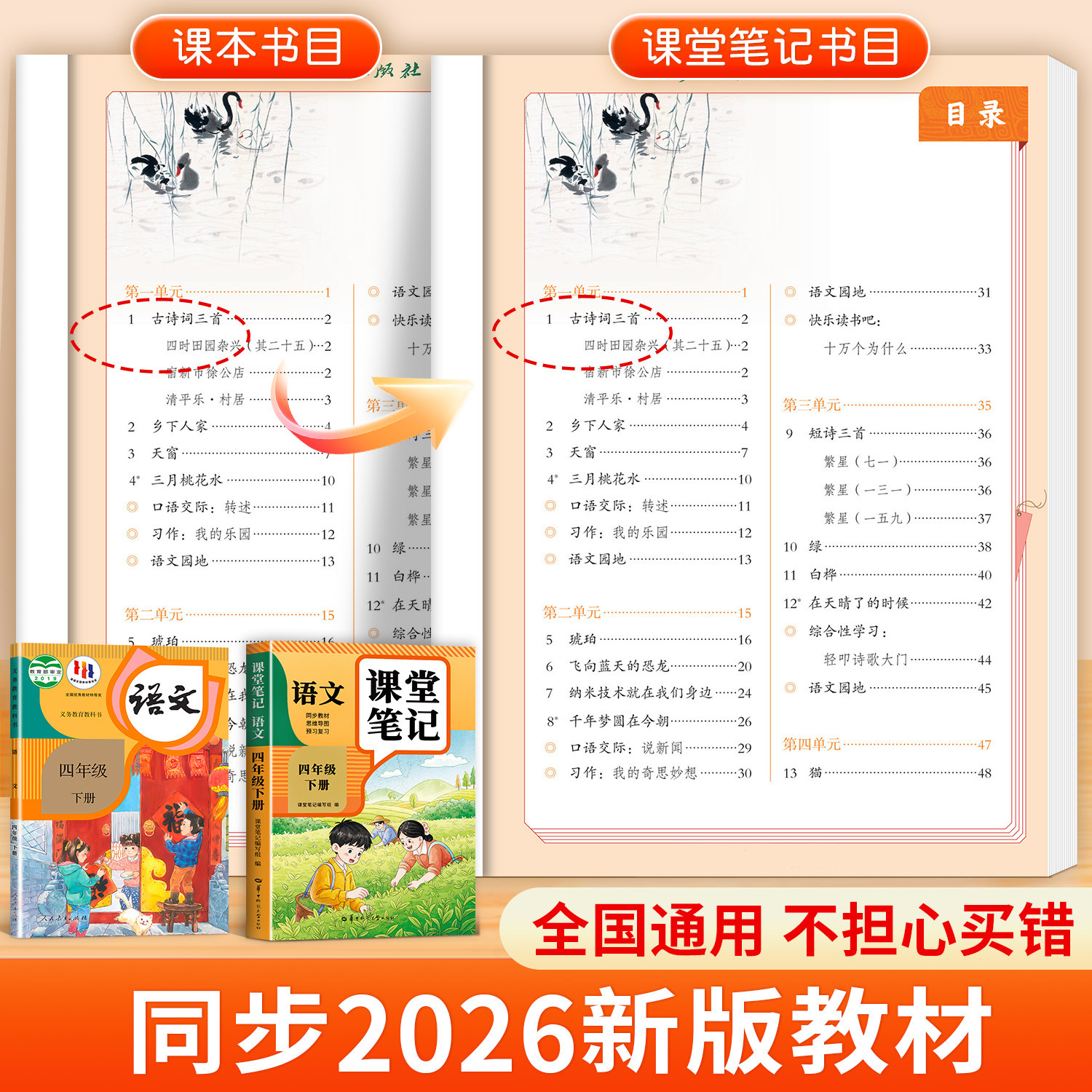 【2026新版】四年级下册课堂笔记(人教版)涵盖语文、数学、英语三科,紧扣教材内容,专为小学生预习与同步学习设计。本书融合状元学霸笔记精华与黄冈一线教学经验,系统梳理每课知识点、重难点解析及考点归纳,搭配清晰思维导图和典型例题,帮助学生高效掌握课堂内容。同步配套课后练习与答案详解,强化理解与运用能力。排版简洁明了,重点突出,适合四年级学生课前预习、课堂笔记补充及课后复习,是提升学习效率、夯实基础的理想助学工具书,助力孩子在学期中稳步进阶,轻松领跑。