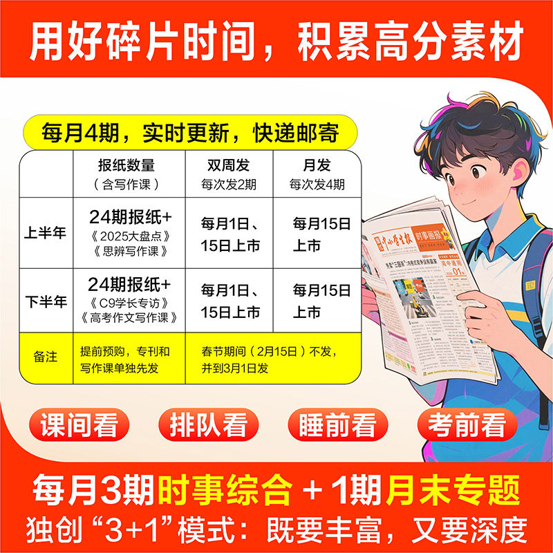 《天星时事画报》2026年春秋季学期版,由天星教育官方旗舰店权威出品,专为高中生打造,聚焦国内外热点时事,精选中考、高考作文高频话题,内容兼具时效性与思想深度。该报融合《现代中小学生报》优质资源,以图文并茂的形式呈现新闻资讯,助力大语文素养提升。每期精选社会、科技、文化等领域的热点事件,配以深度解读与写作素材,帮助学生拓宽视野、积累素材、提升思辨能力。非过期刊设计,学期同步发行,是高中生备战中高考、提升综合素养的理想读物,广受师生好评。