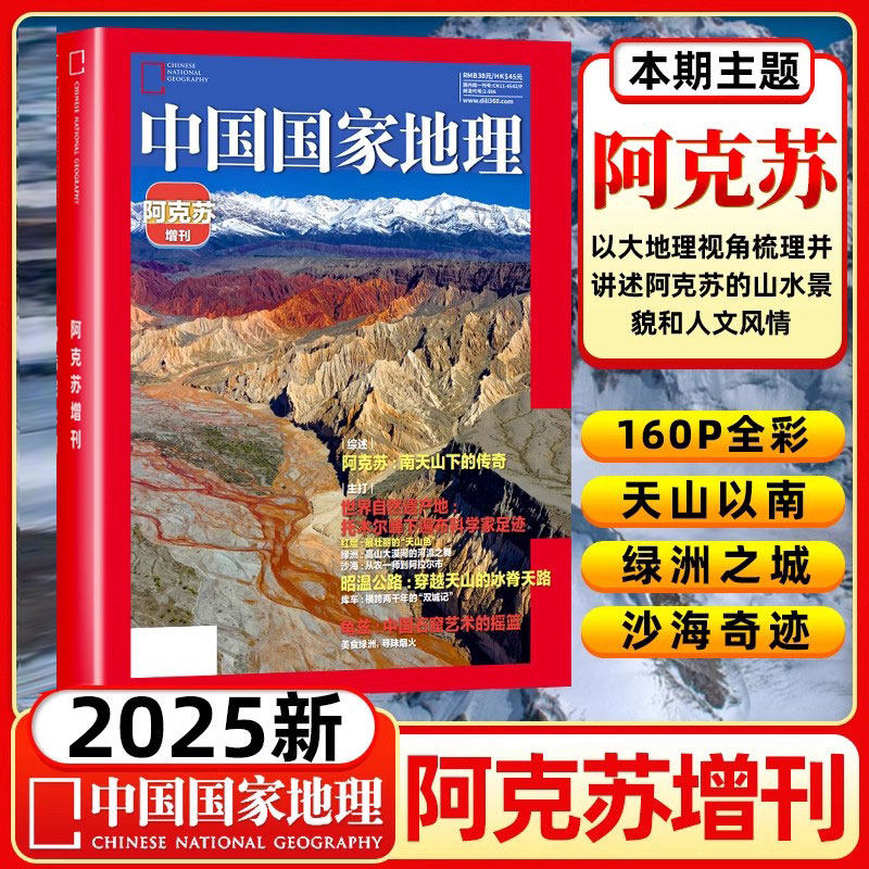 【新疆专题2本增刊】中国国家地理杂志2025年重磅推出阿克苏与喀什双城特刊,深度呈现南疆自然奇观与人文底蕴。阿克苏聚焦龟兹古国历史、天山托木尔大峡谷及绿洲生态;喀什则追溯丝路重镇千年文明,探访古城风貌、巴扎文化与帕米尔高原秘境。两册增刊融合考古发现、民族风情与地理探索,辅以G331、G219国道沿线风光,联动西藏特刊及山河四省、云贵高原专题,构建横贯中国西部的壮美地理图景,展现多元文化交融与生态多样性,是深度了解西域历史、旅行规划与自然人文研究的权威读本。