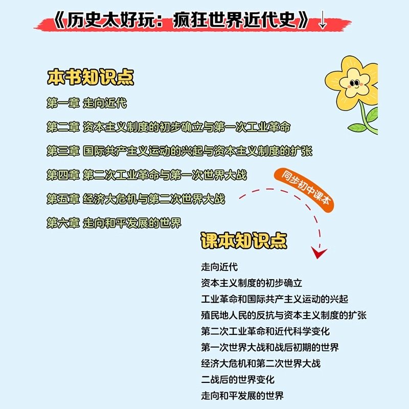 《不白吃漫画历史》系列是一套专为初中生(六至九年级)打造的趣味历史课外读物,以生动幽默的漫画形式讲述世界近代史重点内容,帮助小升初学生顺利衔接中学历史学习。书中将复杂的历史事件、人物和概念转化为轻松易懂的图文故事,涵盖工业革命、殖民扩张、世界大战等关键知识点,突破传统教材枯燥模式。内容紧扣课标重点难点,兼具知识性与趣味性,是预习复习、拓展视野的理想百科读物。“不白吃”用爆笑语言让历史“活”起来,让孩子在笑声中掌握核心知识,真正实现“不白痴”式高效学习,是初中生必读的优质历史启蒙书。