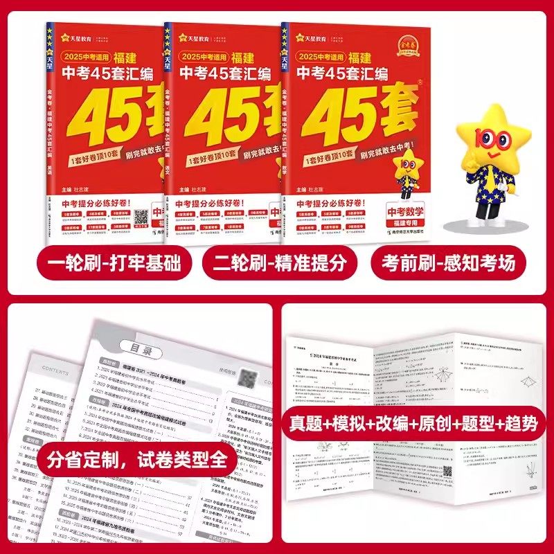 天星教育《金考卷2026福建中考45套汇编》专为福建新中考设计,涵盖地理、生物、语文、数学、英语、物理、化学、道德与法治、历史九大学科。精选福建省近五年中考真题及优质模拟题,科学汇编成45套高质量试卷,紧扣新课标与福建考情,突出核心考点与命题趋势。每套试卷均配有详细解析,帮助学生精准把握答题思路,提升应试能力。专题分类训练与全真模拟相结合,强化知识整合与实战应用,是福建初三学生备考复习的高效利器,助力考生系统梳理知识体系,从容迎战中考。