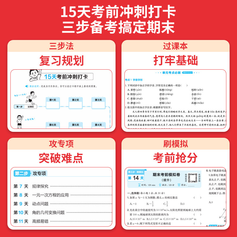2025秋一本初中15天期末复习冲刺卷(七八年级上册)全套试卷,涵盖语文、数学、英语、物理、历史、地理、生物七科,紧扣人教版教材,专为期末考前15天高效冲刺设计。试卷精选典型题型,融合基础知识与综合应用,突出重难点和易错点,帮助学生系统梳理知识体系。每科包含多套模拟卷与综合测试卷,题型贴近期末考试真题,难度适中,兼顾基础巩固与能力提升。通过限时训练,强化答题技巧,提升应试能力,是初中生期末复习的理想备考资料,助力学生从容应考、取得理想成绩。