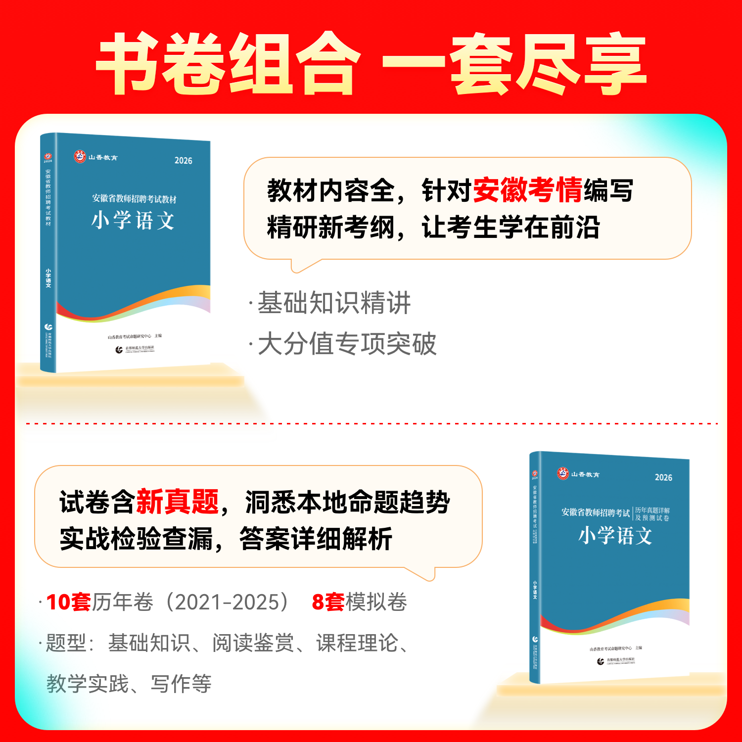2026年安徽省教师招聘考试专用教材《学科专业知识·小学语文》及配套《通用版真题押题试卷》,专为备考小学语文教师岗位的考生精心编写。教材紧扣安徽省最新考试大纲,系统梳理小学语文课程标准、教材教法、文学常识、语言文字运用等核心知识点,内容权威、重点突出。真题押题试卷精选近年典型考题,并依据命题趋势命制高质量模拟题,题型全面、难度适中,助力考生熟悉考试节奏、提升应试能力。全书结构清晰,讲练结合,是考生高效备考、冲刺高分的理想之选。