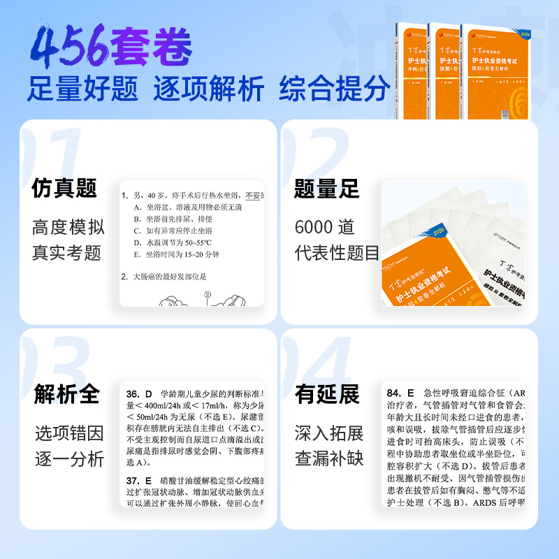 2026年丁震全国护士执业资格考试《456套卷》(职业·原军医版)是专为护考考生打造的高效备考习题集。本书由资深护考专家丁震主编,紧扣最新考试大纲,精选456套高质量押题试卷,覆盖全部核心考点,题型贴近真实考试,难度适中。内容科学编排,重点突出,配有详细解析,帮助考生快速掌握答题技巧,提升应试能力。非人卫版本,独立出版,以“轻松过护考”为理念,助力考生高效复习、精准提分。无论是基础巩固还是冲刺突破,本书都是护考路上的得力助手,广受考生信赖与推荐。