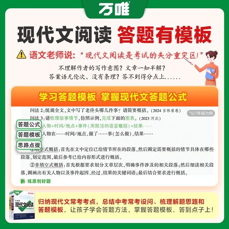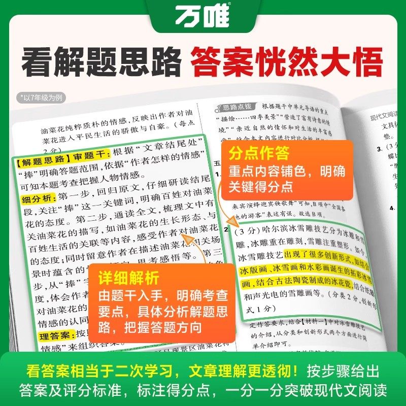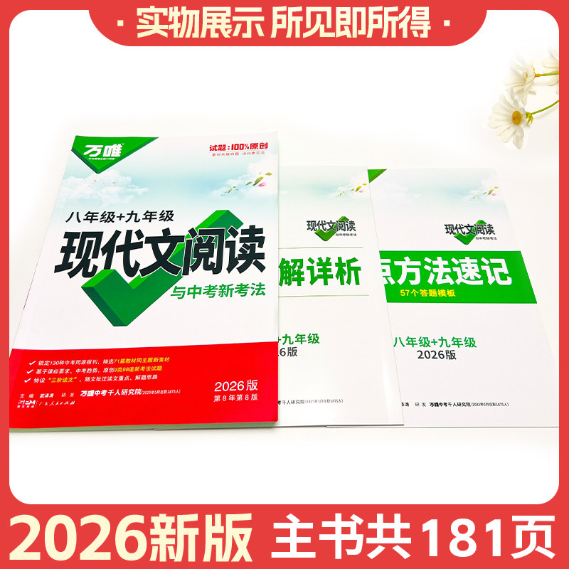 2026版《万唯中考语文现代文阅读·课外文言文阅读》专为七八九年级学生打造,紧扣中考新考法,系统整合现代文阅读、课外文言文、名著阅读三大核心板块。精选历年真题与优质模拟题,覆盖记叙文、说明文、议论文及经典文言篇目,注重思维训练与答题技巧点拨。结合新课标要求,强化文本理解、信息整合与语言表达能力,帮助学生突破阅读瓶颈。名著部分聚焦中考高频考点,提供精要解读与实战演练。全书结构清晰,讲练结合,助力初中生高效备考,全面提升语文综合素养,迎战2026年中考。